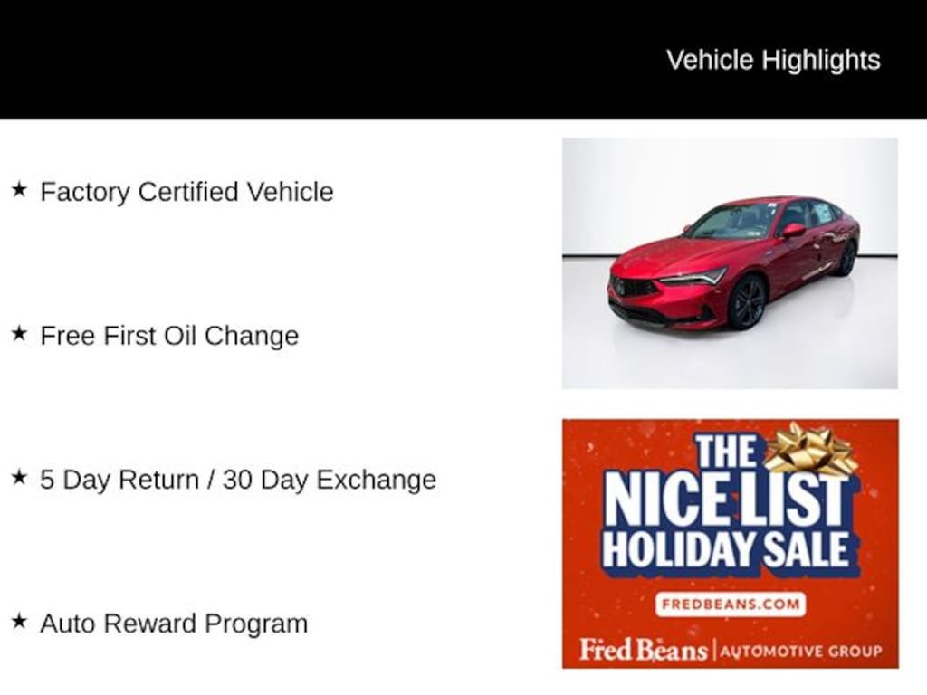 CARFAX One-Owner. Clean CARFAX. 29/36 City/Highway MPG 2025 Acura Integra A-Spec Package 1.5L I4 DOHC 16V CVT FWD 4D Hatchback Performance Red Pearl For better peace of mind all our used vehicles have a 127-point inspection and come with a 5-day return, 30-day exchange (As-Is vehicles are excluded). Our exclusive Auto Rewards Program provides better value with Free First Oil change, Free Pa State Safety inspections, discounts for local merchants and more. Plus, you can earn up to $2000 towards your next vehicle just by servicing with Fred Beans! As Fred Beans always says, our used cars are better because our reputation depends on it.