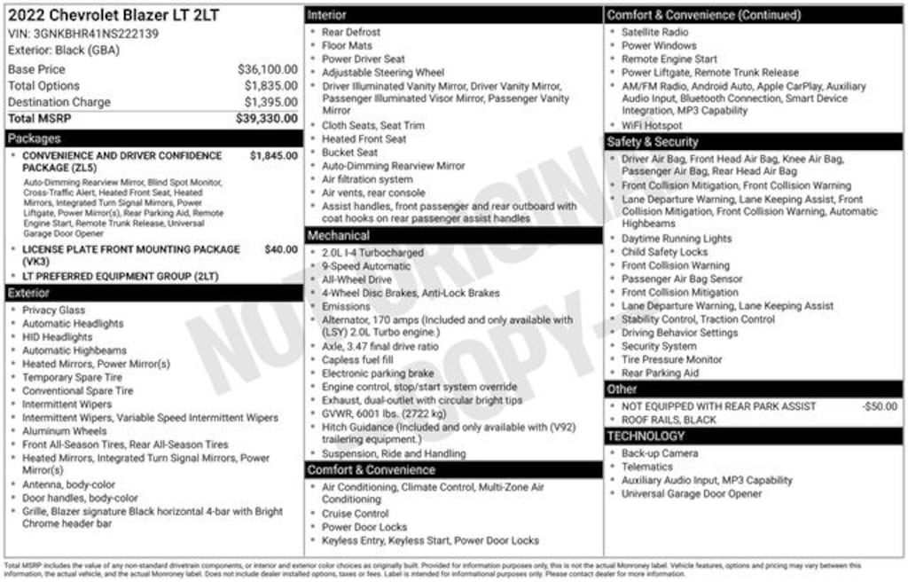 This is one impressive car. I purchased the Chevrolet Blazer with 6 cylinder engine. It has everything I want. Great acceleration, Great styling, Quiet engine, Well equiped, I really like the turn signals in the mirrors, push button start, blind spot monitoring, cross traffic monitoring, Continental Tires, and easy pairing of cell phone. I did not get AWD or GPS. There is nothing, I would change and for the price, a great deal to boot. You won't be disappointed.… - 5.0