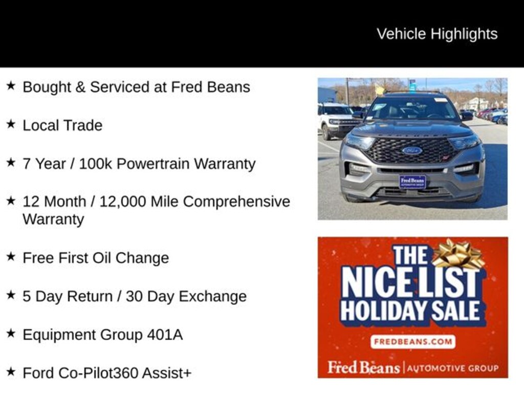 This Explorer ST is packed with premium features that elevate your driving experience, including the renowned B&O Sound System, a 10.1" touchscreen display, and a panoramic twin-panel moonroof. Advanced safety technologies like Intelligent Adaptive Cruise Control, Evasive Steering Assist, and a 360-Degree Camera with Split View ensure your peace of mind on the road.