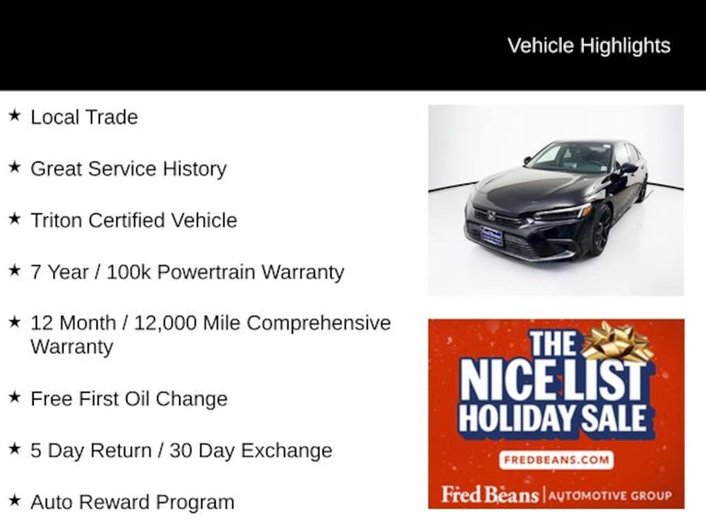 2023 Honda Civic Sport Sport 2.0L I4 DOHC 16V i-VTEC CVT FWD 4D Sedan Black Local Trade, Great Service History, Triton Certified Vehicle, 7 Year / 100k Powertrain Warranty, 12 Month / 12,000 Mile Comprehensive Warranty, Free First Oil Change, 5 Day Return / 30 Day Exchange, Auto Reward Program, Black Cloth.