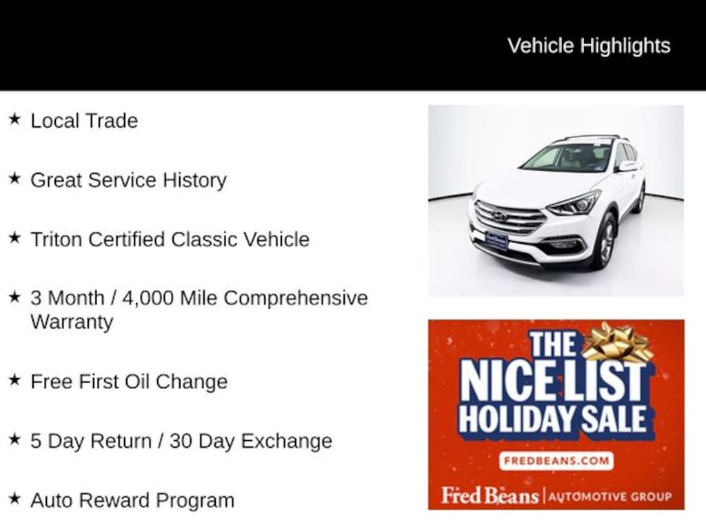 2018 Hyundai Santa Fe Sport 2.4 Base 2.4 Base 2.4L I4 DGI DOHC 16V 6-Speed Automatic with Shiftronic AWD 4D Sport Utility Pearl White Local Trade, Great Service History, Triton Certified Classic Vehicle, 3 Month / 4,000 Mile Comprehensive Warranty, Free First Oil Change, 5 Day Return / 30 Day Exchange, Auto Reward Program.