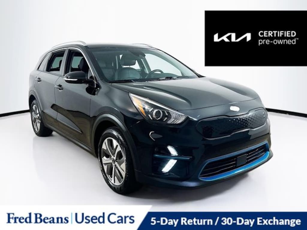 2021 Kia Niro EV EX Electric Motor 1-Speed Automatic FWD 4D Sport Utility Aurora Black Pearl Kia Certified Pre-Owned Certified, 17" Alloy Wheels, 4-Wheel Disc Brakes, 6 Speakers, 8.21 Axle Ratio, ABS brakes, Air Conditioning, Alloy wheels, AM/FM radio: SiriusXM, Auto High-beam Headlights, Automatic temperature control, Battery Heater, Bodyside moldings, Brake assist, Bumpers: body-color, Carpeted Floor Mats, Cloth & Artificial Leather Seat Trim, Cold Weather Package, Delay-off headlights, Driver door bin, Driver vanity mirror, Dual front impact airbags, Dual front side impact airbags, Electronic Stability Control, Emergency communication system: UVO link 911 Connect, Exterior Parking Camera Rear, Four wheel independent suspension, Front anti-roll bar, Front Bucket Seats, Front Center Armrest, Front fog lights, Front reading lights, Fully automatic headlights, Heat Pump, Heated door mirrors, Heated Front Bucket Seats, Heated front seats, Heated Steering Wheel, Illuminated entry, Knee airbag, Low tire pressure warning, Occupant sensing airbag, Outside temperature display, Overhead airbag, Overhead console, Panic alarm, Passenger door bin, Passenger vanity mirror, Power door mirrors, Power driver seat, Power steering, Power windows, Radio: AM/FM/SiriusXM, Rear anti-roll bar, Rear seat center armrest, Rear window defroster, Rear window wiper, Remote keyless entry, Roof rack: rails only, Security system, Speed control, Speed-sensing steering, Split folding rear seat, Spoiler, Steering wheel mounted audio controls, Telescoping steering wheel, Tilt steering wheel, Traction control, Trip computer, Turn signal indicator mirrors, Variably intermittent wipers.