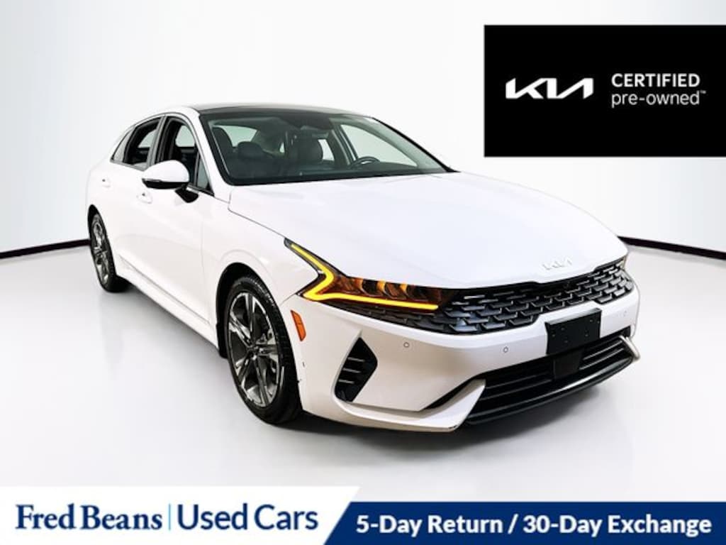 Recent Arrival! 2022 Kia K5 EX I4 8-Speed Automatic FWD 4D Sedan Glacial White Pearl Kia Certified Pre-Owned Certified, 10-Way Power Passenger Seat, 4-Wheel Disc Brakes, 6 Speakers, ABS brakes, Active Sound Design, Air Conditioning, Alloy wheels, AM/FM radio: SiriusXM, Apple CarPlay & Android Auto, Auto High-beam Headlights, Auto Up/Down Rear Windows, Automatic temperature control, Bose Premium Audio, Brake assist, Bumpers: body-color, Carpeted Floor Mats, Delay-off headlights, Driver door bin, Driver vanity mirror, Dual front impact airbags, Dual front side impact airbags, Electronic Stability Control, Emergency communication system, EX Premium Package, Forward Collision Avoidance-Assist - Cyclist, Forward Collision Avoidance-Assist - Junction Turn, Four wheel independent suspension, Front anti-roll bar, Front Bucket Seats, Front Center Armrest, Front dual zone A/C, Front reading lights, Fully automatic headlights, Heated & Ventilated Front Bucket Seats, Heated door mirrors, Heated front seats, Heated Steering Wheel, Illuminated entry, Knee airbag, Leatherette Seat Trim, LED Rear Combi Lamps, Low tire pressure warning, Memory Driver's Seat & Outside Mirrors, Navigation System, Navigation-Based Smart Cruise Control - Curve, Occupant sensing airbag, Outside Mirrors w/LED Turn Signals, Outside temperature display, Overhead airbag, Overhead console, Panic alarm, Parking Collision Avoidance-Assist - Reverse, Parking Distance Warning - Forward, Passenger door bin, Passenger vanity mirror, Power Child Lock, Power door mirrors, Power driver seat, Power Folding Outside Mirrors, Power moonroof, Power steering, Power windows, Radio data system, Radio: AM/FM/MP3 Audio System, Rear anti-roll bar, Rear reading lights, Rear seat center armrest, Rear side impact airbag, Rear window defroster, Remote keyless entry, Safe Exit Assist w/Lock, Security system, Smart Cruise Control w/Stop & Go, Smart Key w/ Push Button and Remote Start, Speed control, Speed-sensing steering, Split folding rear seat, Steering wheel mounted audio controls, Surround View Monitor, Tachometer, Telescoping steering wheel, Tilt steering wheel, Traction control, Trip computer, Variably intermittent wipers, Ventilated front seats, Wheel Locks, Wheels: 7.5J x 18" Gray Machined Finish Alloy.