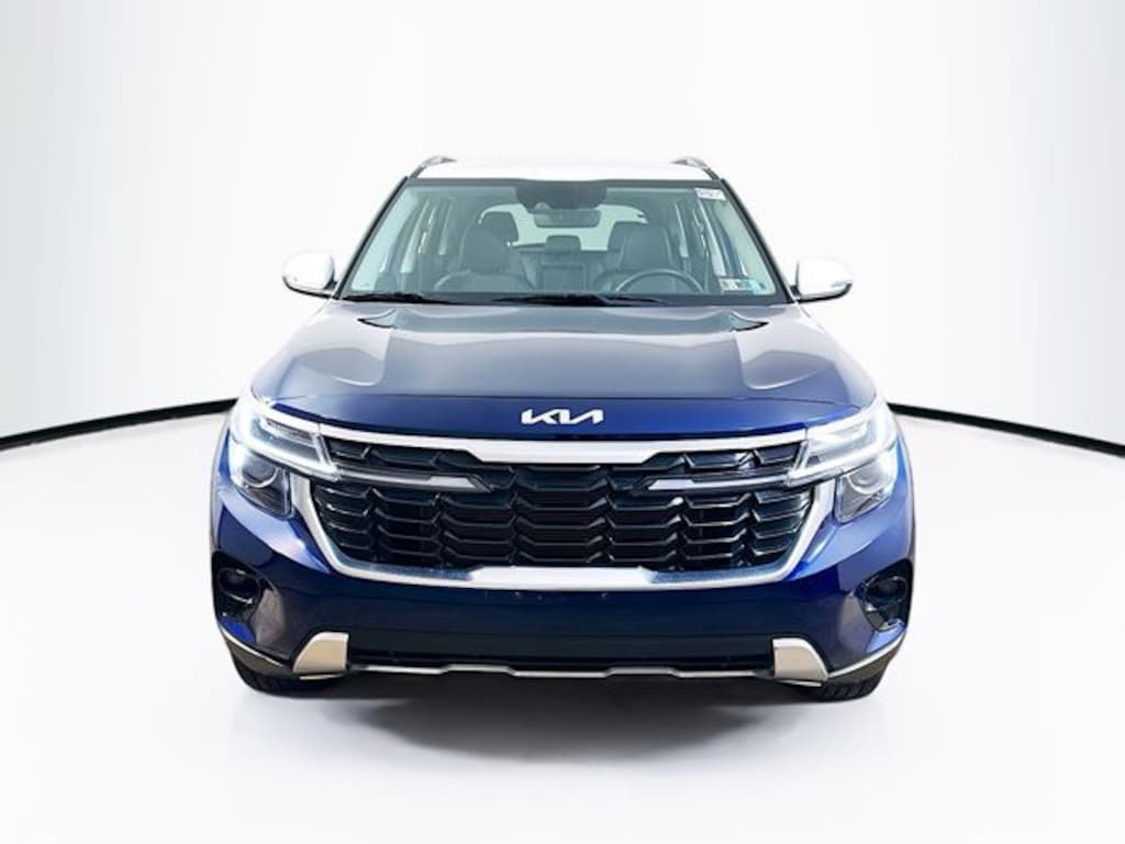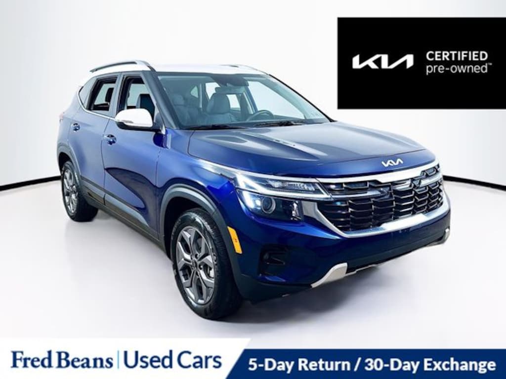 2024 Kia Seltos S 2.0L I4 MPI CVT AWD 4D Sport Utility Dark Ocean Blue/White Roof Kia Certified Pre-Owned Certified, 4-Wheel Disc Brakes, 6 Speakers, 6.052 Axle Ratio, ABS brakes, Air Conditioning, Alloy wheels, AM/FM radio: SiriusXM, Apple CarPlay & Android Auto, Auto High-beam Headlights, Automatic temperature control, Brake assist, Bumpers: body-color, Cargo Net (Floor), Carpet Floor Mats, Cloth & Sofino Premium Leatherette Seat Trim, Delay-off headlights, Driver door bin, Driver vanity mirror, Dual front impact airbags, Dual front side impact airbags, Electronic Stability Control, Emergency communication system: 911 Connect, Exterior Parking Camera Rear, Four wheel independent suspension, Front anti-roll bar, Front Bucket Seats, Front Center Armrest, Front fog lights, Front reading lights, Fully automatic headlights, Glossy Black Door Garnish, Glossy Black Door Garnish Package, Heated door mirrors, Heated Front Bucket Seats, Heated front seats, Illuminated entry, Leather Shift Knob, Leather steering wheel, Low tire pressure warning, Mud Guards, Navigation System, Occupant sensing airbag, Outside temperature display, Overhead airbag, Overhead console, Panic alarm, Passenger door bin, Passenger vanity mirror, Power door mirrors, Power steering, Power windows, Radio: AM/FM/HD/Satellite Display System w/Navigation, Rear seat center armrest, Rear window defroster, Rear window wiper, Remote keyless entry, Reversible Cargo Mat/Tray, Security system, Speed control, Speed-sensing steering, Split folding rear seat, Spoiler, Steering wheel mounted audio controls, Tachometer, Telescoping steering wheel, Tilt steering wheel, Traction control, Trip computer, Turn signal indicator mirrors, Variably intermittent wipers, Wheels: 17" Alloy w/Dark Gray Finish.