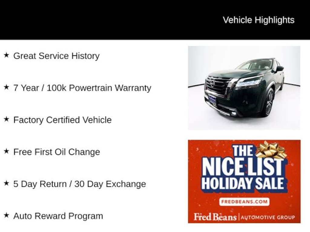 2022 Nissan Pathfinder Platinum Platinum V6 9-Speed Automatic 4WD 4D Sport Utility Obsidian Green Pearl Great Service History, 7 Year / 100k Powertrain Warranty, Factory Certified Vehicle, Free First Oil Change, 5 Day Return / 30 Day Exchange, Auto Reward Program, 4WD.
