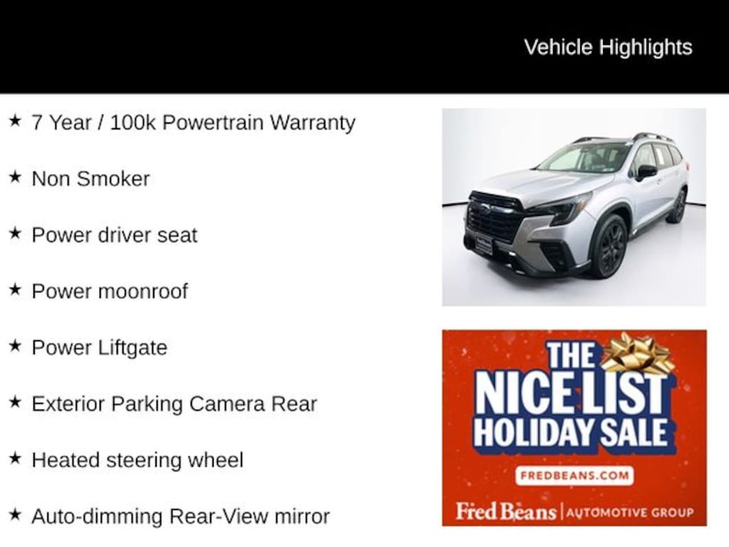 2024 Subaru Ascent Onyx Edition 2.4L 4-Cylinder DOHC 16V Lineartronic CVT AWD 4D Sport Utility Ice Silver Metallic 7 Year / 100k Powertrain Warranty, Non Smoker, Auto-dimming Rear-View mirror, Exterior Parking Camera Rear, Heated front seats, Heated steering wheel, Power driver seat, Power Liftgate, Power moonroof, STARLINK/Apple CarPlay/Android Auto.