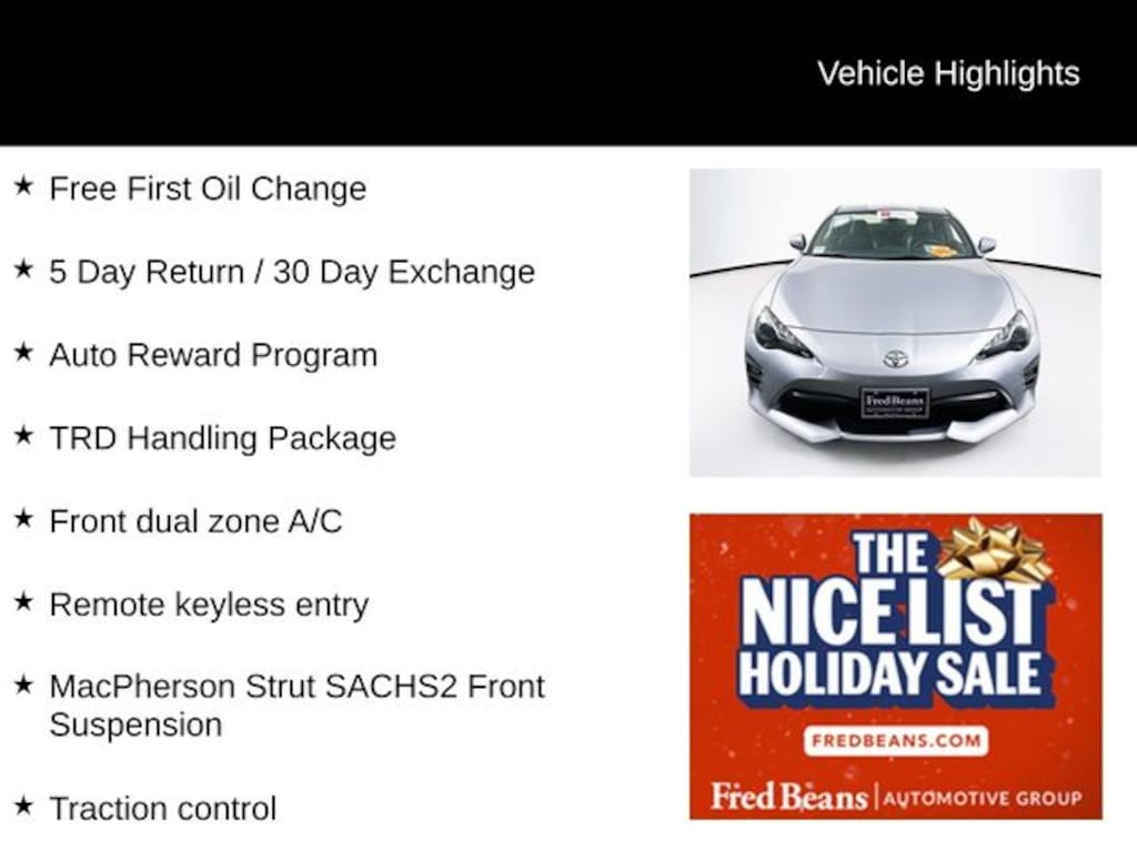 2020 Toyota 86 GT 2.0L H4 PDI DOHC 16V LEV3-LEV160 205hp Close-Ratio 6-Speed Manual RWD 2D Coupe Steel Free First Oil Change, 5 Day Return / 30 Day Exchange, Auto Reward Program, 86 GT, 2D Coupe, 2.0L H4 PDI DOHC 16V LEV3-LEV160 205hp, Close-Ratio 6-Speed Manual, RWD, Steel, Black w/Fabric Seat Material, ABS brakes, Alloy wheels, Brembo Front Wheel Brake, Electronic Stability Control, Front dual zone A/C, Heated door mirrors, Heated front seats, Illuminated entry, Low tire pressure warning, MacPherson Strut SACHS2 Front Suspension, Remote keyless entry, Traction control, TRD Handling Package.
