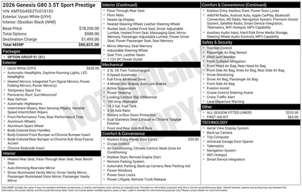 This car is an unbelievable value. I have a 3.5L Twin Turbo with AWD and the Prestige package (I highly recommend the Prestige package due to the Heads Up display and several other luxury options included). The owners manual leaves a lot to be desired. It is hard to find explanations of the numerous features. For example, I have two buttons, cryptically labeled, on the overhead panel where the dome light and sunroof controls reside. I cannot find the difference between the two buttons in the owners manual. Both light the dome light but I cannot figure out why there are two buttons for the light. That is just an example - the manual must have been translated from Korean, and poorly at that. Ride is smooth as silk, with windows closed a boom box next to my car is silent, acceleration is remarkable for a car as heavy as this. Gas mileage is terrible though. Around town, I get 16 mpg with a light foot. On the road, I get around 19 mpg. Wondering if there is something wrong with my fuel delivery system. Have not asked Genesis for valet pickup and drop-off of my car for service but based on comments in the G80 blog, dealers are reluctant to deliver on the promised service, not to mention they say loaner cars are not available.… - 5.0