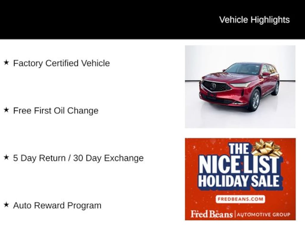 CARFAX One-Owner. Clean CARFAX. Recent Arrival! 2023 Acura MDX 3.5L SH-AWD V6 10-Speed Automatic AWD 4D Sport Utility Red For better peace of mind all our used vehicles have a 127-point inspection and come with a 5-day return, 30-day exchange (As-Is vehicles are excluded). Our exclusive Auto Rewards Program provides better value with Free First Oil change, Free Pa State Safety inspections, discounts for local merchants and more. Plus, you can earn up to $2000 towards your next vehicle just by servicing with Fred Beans! As Fred Beans always says, our used cars are better because our reputation depends on it.