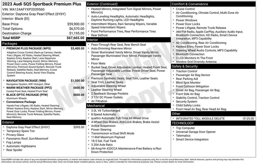 Recent Arrival! 2023 Audi SQ5 Sportback Premium Plus quattro 3.0L TFSI 8-Speed Automatic with Tiptronic quattro 4D Sport Utility Daytona Gray Pearl Effect Great Service History, Remainder of Factory Warranty, Audi Active Lane Assist, Audi Virtual Cockpit Plus, Bang & Olufsen 3D Sound System, Black Exterior Mirror Housings, Black Exterior Trim, Black Optic Package, Convenience Package, Hands-On Detection Steering Wheel, Leather Seating Surfaces, Leatherette Covered Center Console, Navigation Package, Navigation System, Premium Plus Package, Radio: MMI Navigation Plus, Rear Manual Side Window Shades, Top View Camera System, Traffic Jam Assist, Ventilated Front Seats, Warm Weather Package, Wheels: 20" 5-V Spoke-Star Design.CARFAX One-Owner. Clean CARFAX. Odometer is 2253 miles below market average!For better peace of mind all our used vehicles have a 127-point inspection and come with a 5-day return, 30-day exchange (As-Is vehicles are excluded). Our exclusive Auto Rewards Program provides better value with Free First Oil change, Free Pa State Safety inspections, discounts for local merchants and more. Plus, you can earn up to $2000 towards your next vehicle just by servicing with Fred Beans! As Fred Beans always says, our used cars are better because our reputation depends on it.Although every reasonable effort has been made to ensure the accuracy of the information contained on this site, absolute accuracy cannot be guaranteed. This site, and all information and materials appearing on it, are presented to the user "as is" without warranty of any kind, either express or implied. All vehicles are subject to prior sale. Price does not include applicable tax, title, license, processing and/or documentation fees. â¡Vehicles shown at different locations are not currently in our inventory (Not in Stock) but can be made available to you at our location within a reasonable date from the time of your request, not to exceed one week. Residency restrictions may apply.