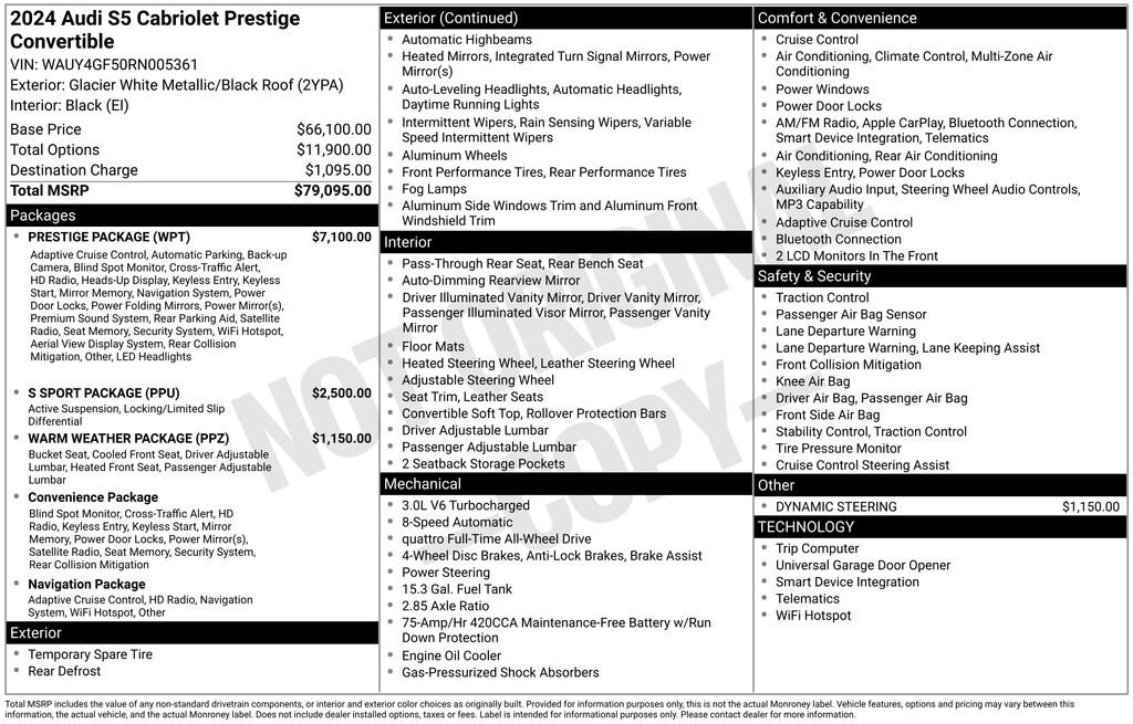 Recent Arrival! 2024 Audi S5 3.0T Prestige quattro 3.0L TFSI 8-Speed Automatic with Tiptronic quattro 2D Convertible Glacier White Metallic Great Service History, Remainder of Factory Warranty, Free First Oil Change, Auto Reward Program, Animation for Headlights & Taillights, Audi Laser Light & Headlight Washers, Audi Virtual Cockpit Plus, Bang & Olufsen Sound System w/3D Sound, Convenience Package, Head-Up Display, Leather Seating Surfaces, Leatherette Covered Center Console & Door Armrests, LED Interior Lighting Plus Package, Navigation Package, Navigation System, Neck-Level Heating System, Park Assist, Power Folding Exterior Mirrors, Prestige Package, Red Brake Calipers, S Sport Package, Sport Adaptive Damping Suspension, Sport Rear Differential, Top View Camera System, Ventilated Front Sport Seats, Warm Weather Package, Wireless Phone Charging Pad.CARFAX One-Owner. Clean CARFAX.For better peace of mind all our used vehicles have a 127-point inspection and come with a 5-day return, 30-day exchange (As-Is vehicles are excluded). Our exclusive Auto Rewards Program provides better value with Free First Oil change, Free Pa State Safety inspections, discounts for local merchants and more. Plus, you can earn up to $2000 towards your next vehicle just by servicing with Fred Beans! As Fred Beans always says, our used cars are better because our reputation depends on it.Although every reasonable effort has been made to ensure the accuracy of the information contained on this site, absolute accuracy cannot be guaranteed. This site, and all information and materials appearing on it, are presented to the user "as is" without warranty of any kind, either express or implied. All vehicles are subject to prior sale. Price does not include applicable tax, title, license, processing and/or documentation fees. â¡Vehicles shown at different locations are not currently in our inventory (Not in Stock) but can be made available to you at our location within a reasonable date from the time of your request, not to exceed one week. Residency restrictions may apply.