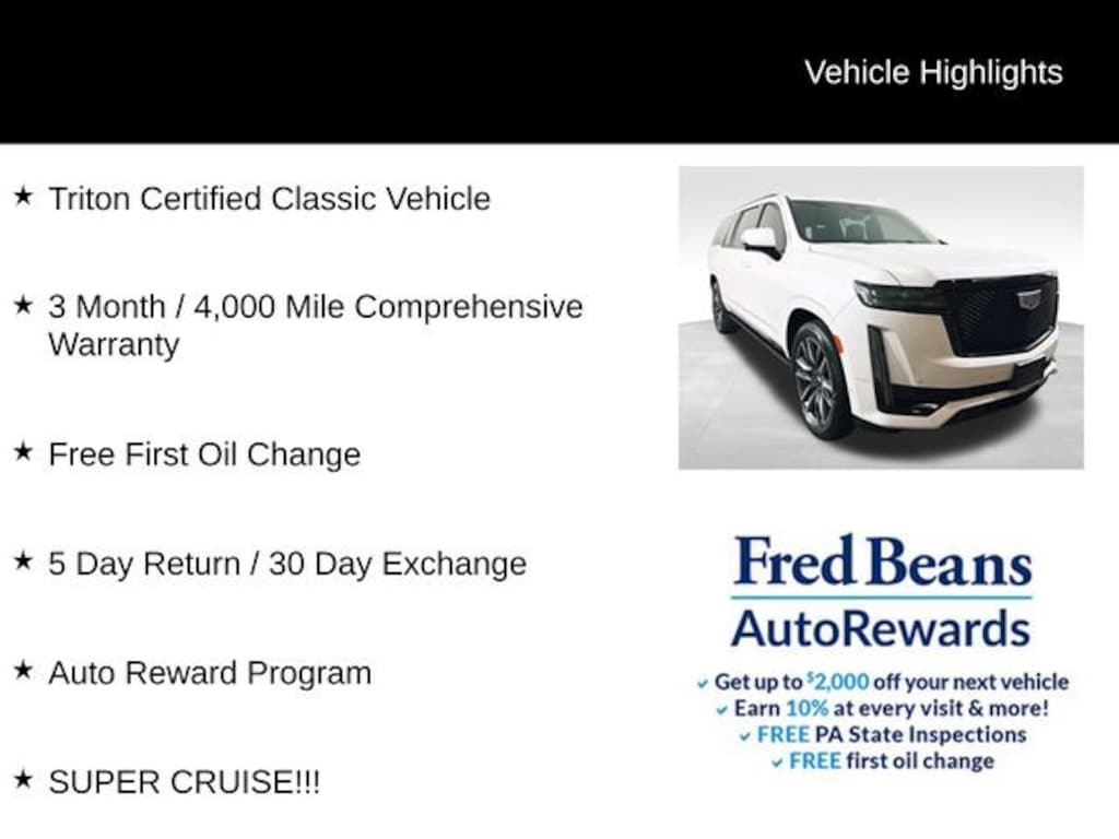 2021 Cadillac Escalade ESV Sport 6.2L V8 10-Speed Automatic with Overdrive 4WD 4D Sport Utility Crystal White Tricoat Triton Certified Classic Vehicle, 3 Month / 4,000 Mile Comprehensive Warranty, Free First Oil Change, 5 Day Return / 30 Day Exchange, Auto Reward Program, SUPER CRUISE!!!, 4WD.