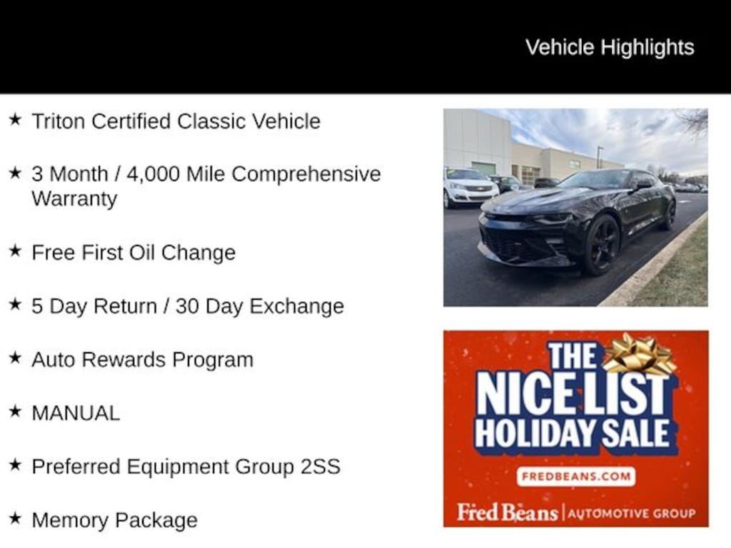 Recent Arrival! 2016 Chevrolet Camaro SS 2SS 6.2L V8 6-Speed Manual RWD 2D Coupe Black Triton Certified Classic Vehicle, 3 Month / 4,000 Mile Comprehensive Warranty, Free First Oil Change, 5 Day Return / 30 Day Exchange, Auto Rewards Program, MANUAL, Alloy wheels, Apple CarPlay, Auto-Dimming Inside Rearview Frameless Mirror, Body-Color Outside Heated Power-Adjustable Mirrors, Bose Premium 9-Speaker Audio System Feature, Dual Mode Performance Exhaust, Dual-Zone Automatic Climate Control, Exterior Parking Camera Rear, Front dual zone A/C, Fully automatic headlights, Head-Up Display, Heated Driver & Front Passenger Seats, Heated Steering Wheel, High-Intensity Discharge Headlights, Illuminated Sill Plates, Interior Spectrum Lighting, Leather-Trimmed Seat Trim, Magnetic Ride Control, Memory Package, Memory seat, Power driver seat, Power passenger seat, Power Sunroof, Preferred Equipment Group 2SS, Radio: Chevrolet MyLink w/Navigation, Rear Cross-Traffic Alert, Rear Park Assist, Side Blind Zone Alert w/Lane Change Alert, SiriusXM Satellite Radio, Telescoping steering wheel, Tilt steering wheel, Universal Home Remote, Ventilated Driver & Front Passenger Seats, Wheels: 20" x 8.5" Fr & 20" x 9.5" Rr 5-Spoke, Wheels: 20" x 8.5" Fr & 20" x 9.5" Rr 5-Spoke Alum, Wireless Charging For Devices.