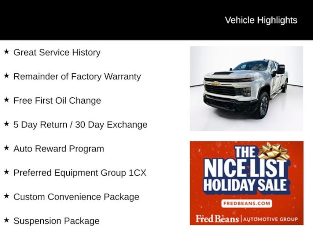 2024 Chevrolet Silverado 2500HD Custom 6.6L V8 10-Speed Automatic 4WD 4D Crew Cab Summit White Great Service History, Remainder of Factory Warranty, Free First Oil Change, 5 Day Return / 30 Day Exchange, Auto Reward Program, 10-Speed Automatic, 4WD, Black Cloth, 10-Way Power Driver Seat Adjuster w/Lumbar, 120-Volt Interior Power Outlet, 170 Amp Alternator, 2-Speed Electronic Shift Transfer Case, 3.5" Diagonal Monochromatic Display DIC, Black Mirror Caps, Bluetooth® For Phone, Chevrolet Connected Access Capable, Color-Keyed Carpeting Floor Covering, Compass, Custom Convenience Package, Deep-Tinted Glass, Electric Rear-Window Defogger, Electronic Cruise Control w/Set & Resume Speed, EZ Lift Power Lock & Release Tailgate, Front Rubberized Vinyl Floor Mats, HD Rear Vision Camera, Heated Vertical Trailering Mirrors, Integrated Trailer Brake Controller, LED Cargo Area Lighting, Locking Tailgate, Manual Tailgate Function w/No EZ Lift, Manual Tilt-Wheel Steering Column, OnStar & Chevrolet Connected Services Capable, Power Door Locks, Power Front Windows w/Driver Express Up/Down, Power Front Windows w/Passenger Express Down, Power Rear Windows w/Express Down, Preferred Equipment Group 1CX, Push Button Start, Rear 60/40 Folding Bench Seat (Folds Up), Rear Rubberized Vinyl Floor Mats, Remote Keyless Entry, Remote Vehicle Starter System, SiriusXM w/360L, Standard Tailgate, Suspension Package, Unauthorized Entry Theft-Deterrent System, Wi-Fi Hotspot Capable, Wireless Phone Projection.