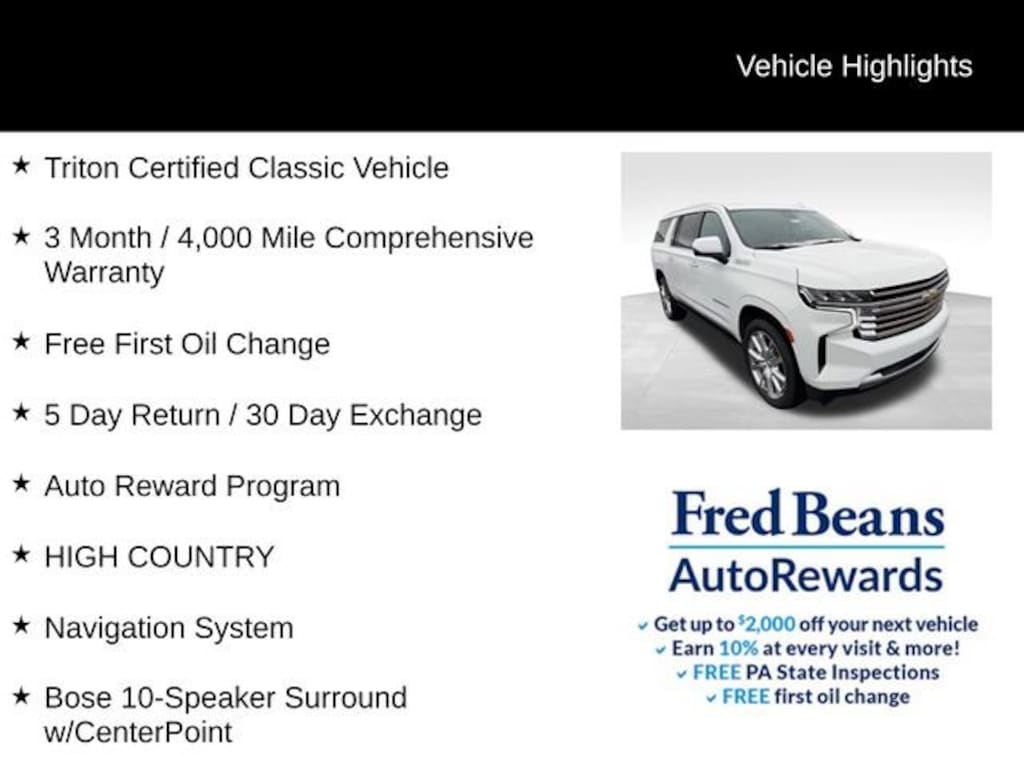 The Triton Certified Classic designation means this Suburban has undergone a rigorous inspection and reconditioning process, ensuring it meets the highest standards of quality and reliability. With a comprehensive 3-month/4,000-mile warranty and a free first oil change, you can drive with confidence, knowing your investment is protected.