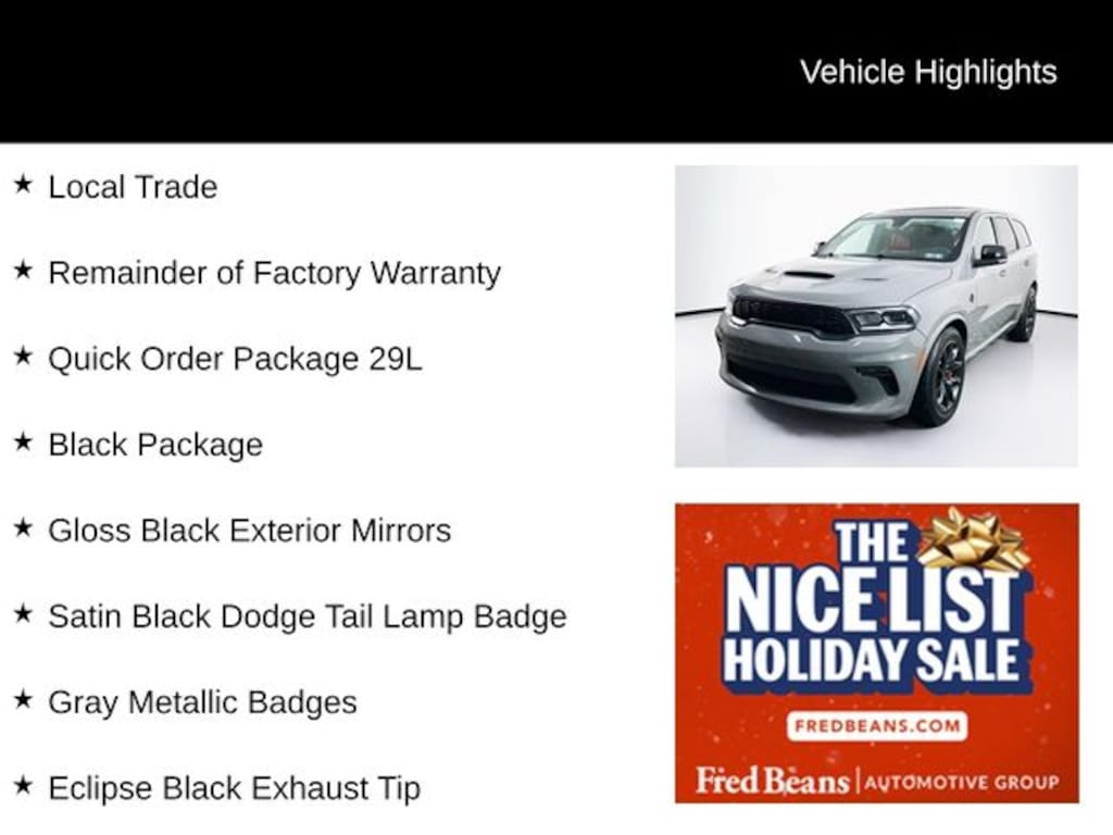 2022 Dodge Durango SRT 392 SRT HEMI 6.4L V8 MDS 8-Speed Automatic AWD 4D Sport Utility Destroyer Gray Clearcoat Local Trade, Remainder of Factory Warranty, AWD, Black Package, Eclipse Black Exhaust Tip, Gloss Black Exterior Mirrors, Gray Metallic Badges, Quick Order Package 29L, Satin Black Dodge Tail Lamp Badge, Wheels: 20" x 10" Lights Out Aluminum.