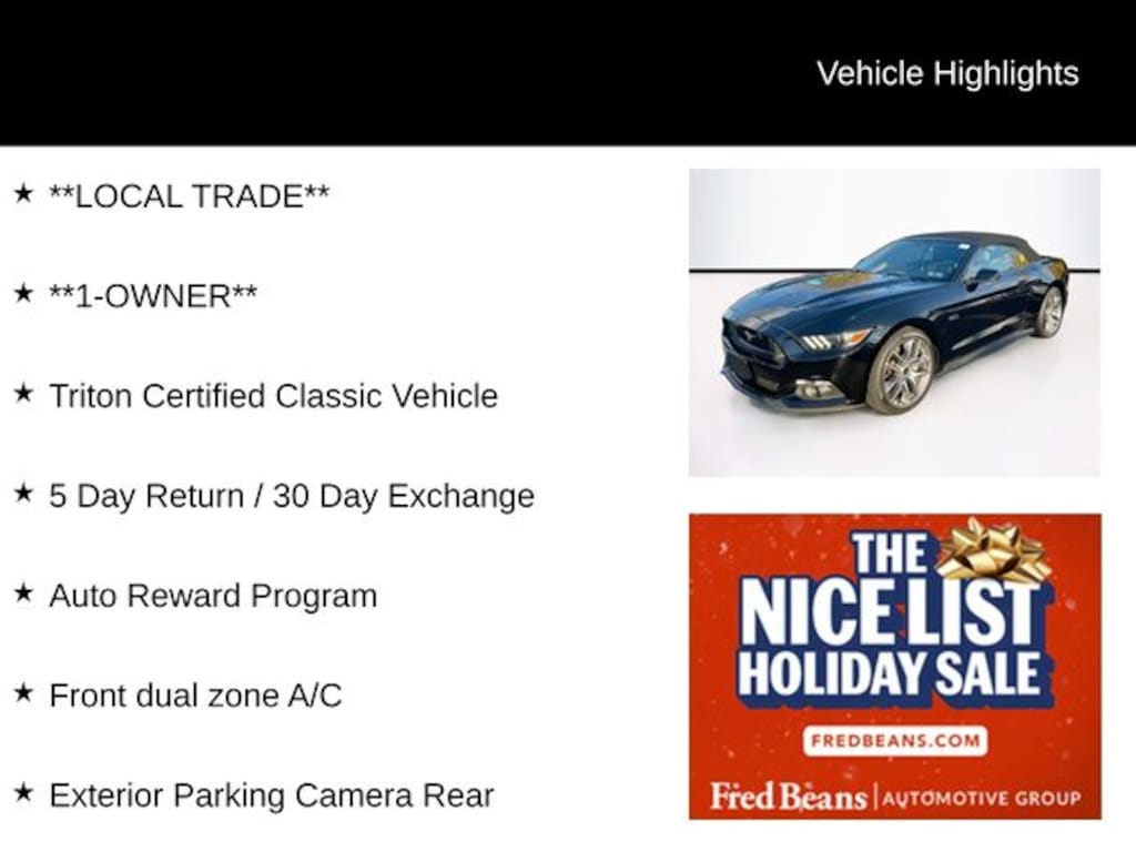 **LOCAL TRADE**, **1-OWNER**, Triton Certified Classic Vehicle, 5 Day Return / 30 Day Exchange, Auto Reward Program, Exterior Parking Camera Rear, Front dual zone A/C, 4-Wheel Disc Brakes, 9 Speakers, ABS brakes, Air Conditioning, Alloy wheels, AM/FM radio: SiriusXM, AM/FM Stereo w/Single CD Player, Auto-dimming Rear-View mirror, Automatic temperature control, Block heater, Brake assist, Bumpers: body-color, CD player, Climate Controlled Heated/Cooled Front Seats, Compass, Convertible roof lining, Delay-off headlights, Driver door bin, Driver vanity mirror, Dual front impact airbags, Dual front side impact airbags, Electronic Stability Control, Emergency communication system: 911 Assist, Four wheel independent suspension, Front anti-roll bar, Front Bucket Seats, Front Center Armrest, Front fog lights, Front reading lights, Fully automatic headlights, Garage door transmitter, Glass rear window, Heated door mirrors, Heated front seats, High-Intensity Discharge Headlights, Illuminated entry, Knee airbag, Leather Bucket Seats, Leather Shift Knob, Low tire pressure warning, Occupant sensing airbag, Outside temperature display, Overhead console, Panic alarm, Passenger door bin, Passenger vanity mirror, Power convertible roof, Power door mirrors, Power driver seat, Power passenger seat, Power steering, Power windows, Radio data system, Rear anti-roll bar, Rear window defroster, Remote keyless entry, Security system, SiriusXM Radio, Speed control, Speed-sensing steering, Speed-Sensitive Wipers, Spoiler, Steering wheel mounted audio controls, SYNC 3 Communications & Entertainment System, Tachometer, Telescoping steering wheel, Tilt steering wheel, Traction control, Trip computer, Turn signal indicator mirrors, Variably intermittent wipers, Ventilated front seats, Voltmeter, Wheels: 18" x 8" Magnetic Painted/Machined, Exterior Parking Camera Rear, Front dual zone A/C.