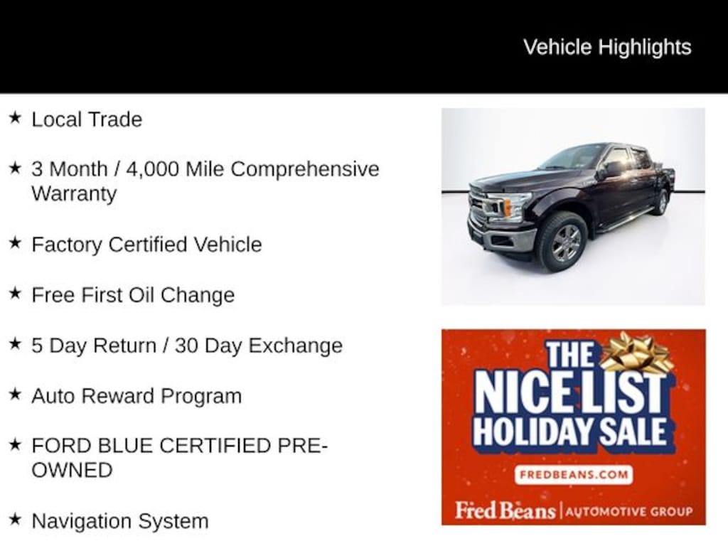 2019 Ford F-150 XLT 2.7L V6 EcoBoost 10-Speed Automatic 4WD 4D SuperCrew Magma Red Local Trade, 3 Month / 4,000 Mile Comprehensive Warranty, Factory Certified Vehicle, Free First Oil Change, 5 Day Return / 30 Day Exchange, Auto Reward Program, 4WD, Navigation System, 110V/400W Outlet, 2-Bar Style Grille w/Chrome 2 Minor Bars, 4-Wheel Disc Brakes, 4.2" Productivity Screen in Instrument Cluster, 6 Speakers, 8-Way Power Driver Seat, ABS brakes, Air Conditioning, Alloy wheels, AM/FM radio, AppLink/Apple CarPlay and Android Auto, Auto High-beam Headlights, Auto-Dimming Rear-View Mirror, Brake assist, Bumpers: chrome, Chrome Door & Tailgate Handles w/Body-Color Bezel, Chrome Step Bars, Class IV Trailer Hitch Receiver, Cloth 40/20/40 Front Seat, Compass, Delay-off headlights, Driver door bin, Driver vanity mirror, Dual front impact airbags, Dual front side impact airbags, Electronic Stability Control, Emergency communication system: SYNC 3 911 Assist, Equipment Group 302A Luxury, Exterior Parking Camera Rear, Fixed Backlight w/Privacy Glass, Front anti-roll bar, Front Center Armrest w/Storage, Front fog lights, Front wheel independent suspension, Fully automatic headlights, GVWR: 6,500 lbs Payload Package, GVWR: 6,600 lbs Payload Package, Heated Front Seats, Illuminated entry, Leather-Wrapped Steering Wheel, LED Box Lighting, Low tire pressure warning, Occupant sensing airbag, Outside temperature display, Overhead airbag, Panic alarm, Passenger door bin, Passenger vanity mirror, Power door mirrors, Power Glass Heated Sideview Mirrors, Power steering, Power windows, Power-Adjustable Pedals, Power-Sliding Rear Window, Pro Trailer Backup Assist, Radio data system, Radio: AM/FM Stereo w/6 Speakers, Rear step bumper, Rear Under-Seat Storage, Rear Window Defroster, Remote keyless entry, Remote Start System, Security system, Single-Tip Chrome Exhaust, SiriusXM Radio, Speed control, Speed-sensing steering, Split folding rear seat, Steering wheel mounted audio controls, SYNC 3, Tachometer, Telescoping steering wheel, Tilt steering wheel, Traction control, Trailer Tow Package, Variably intermittent wipers, Voice-Activated Touchscreen Navigation, Voltmeter, Wheels: 17" Silver Painted Aluminum, Wheels: 18" Chrome-Like PVD, XLT Chrome Appearance Package, XLT Power Equipment Group, FORD BLUE CERTIFIED PRE-OWNED, 4WD, Navigation System.