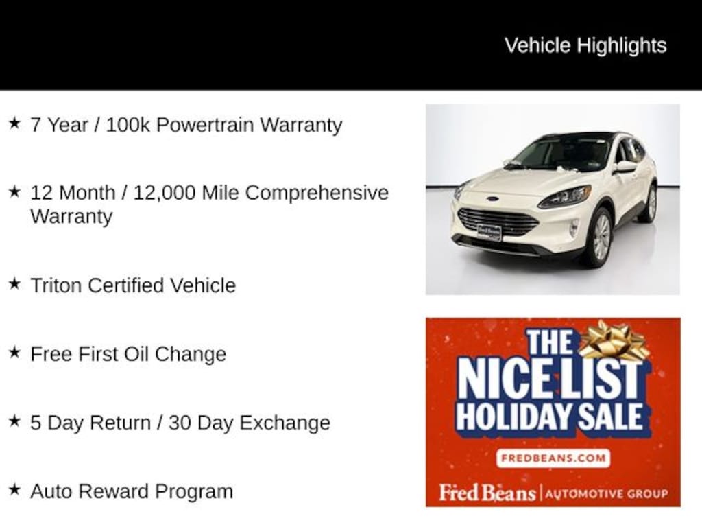 CARFAX One-Owner. Clean CARFAX. 22/31 City/Highway MPG Recent Arrival! 2022 Ford Escape Titanium EcoBoost 2.0L I4 GTDi DOHC Turbocharged VCT 8-Speed Automatic AWD 4D Sport Utility Star White Metallic Tri-Coat For better peace of mind all our used vehicles have a 127-point inspection and come with a 5-day return, 30-day exchange (As-Is vehicles are excluded). Our exclusive Auto Rewards Program provides better value with Free First Oil change, Free Pa State Safety inspections, discounts for local merchants and more. Plus, you can earn up to $2000 towards your next vehicle just by servicing with Fred Beans! As Fred Beans always says, our used cars are better because our reputation depends on it.