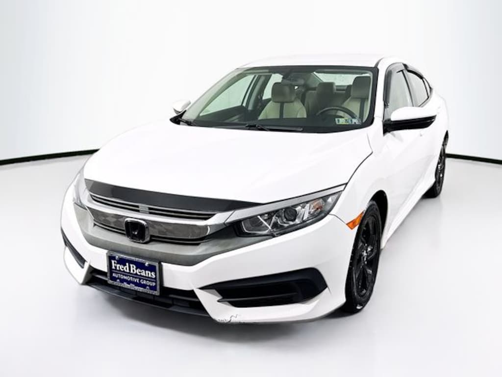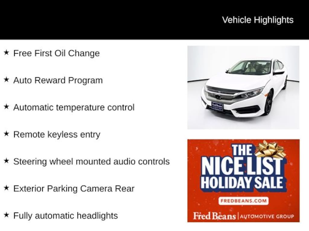 2018 Honda Civic LX 2.0L I4 DOHC 16V i-VTEC CVT FWD 4D Sedan White Free First Oil Change, Auto Reward Program, Cloth, Automatic temperature control, Exterior Parking Camera Rear, Fully automatic headlights, Remote keyless entry, Steering wheel mounted audio controls.