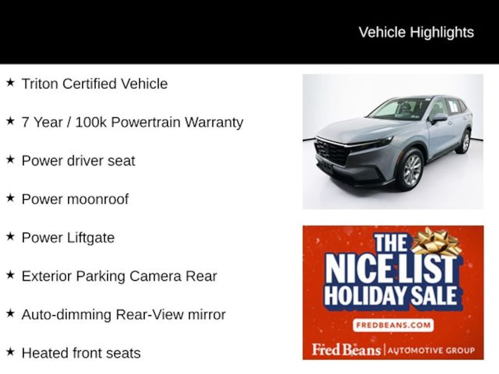 Certified. Certification Program Details: Triton Certified Shield ⢠7-Year or up to 100,000-Mile Powertrain Limited Warranty ⢠12-Month or 12,000-Mile Comprehensive Coverage ($100 deductible) ⢠100+ Multipoint Inspection ⢠All Fluids Checked ⢠Tires 6/32" or Better ⢠50% or Better brakes ⢠Oil, Lube, & Filter Service Completed ⢠PA State Inspection & Emissions Test ⢠5-Day Return Policy1 ⢠30-Day Exchange Policy2 ⢠CARFAXTM Report ⢠AutoRewards Membership ⢠See salesperson for additional offers & complete details.