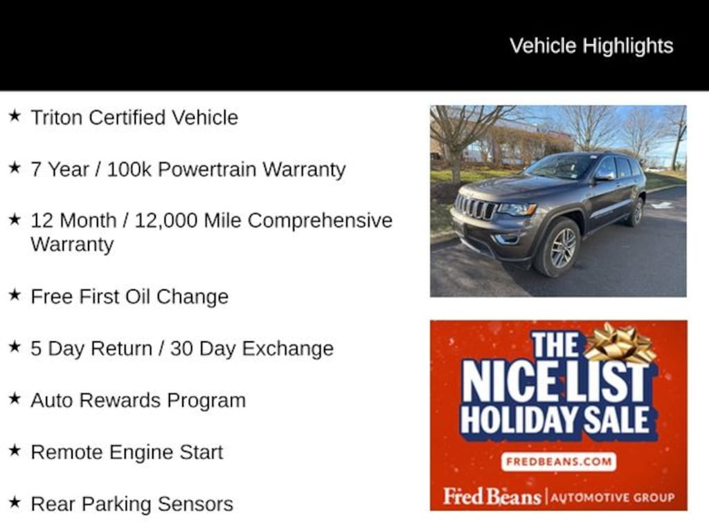 This 2021 Jeep Grand Cherokee Limited comes finished in Granite Crystal Metallic Clearcoat and is powered by a 3.6L V6 paired with an 8-speed automatic transmission and 4WD. This Triton Certified vehicle includes a 7 year or 100,000 mile powertrain warranty, a 12 month or 12,000 mile comprehensive warranty, a free first oil change, a 5 day return and 30 day exchange program, and access to our Auto Rewards Program. It is equipped with remote engine start, rear parking sensors, blind spot monitoring with rear traffic alert, a 1-year SiriusXM Guardian trial, a 4G LTE Wi-Fi hotspot, an 8.4 inch touchscreen display, Apple CarPlay and Android Auto, automatic temperature control, front dual-zone A/C, fully automatic headlights, HD Radio, GPS navigation, heated front seats, a heated steering wheel, leather-trimmed bucket seats, integrated Bluetooth voice command, a memory driverâs seat, ParkView rear back-up camera, a power driver seat, power liftgate, power moonroof, the Quick Order Package 2GH, Uconnect 4C NAV with 8.4 inch display, SiriusXM Satellite Radio with Traffic Plus and Travel Link, and 18 inch Tech Gray Diamond Cut wheels.
