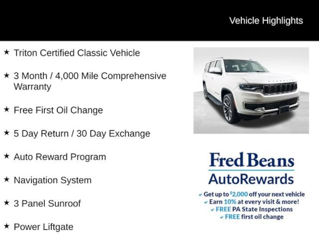 2022 Jeep Wagoneer Series II 5.7L V8 8-Speed Automatic 4WD 4D Sport Utility Luxury White Pearlcoat Triton Certified Classic Vehicle, 3 Month / 4,000 Mile Comprehensive Warranty, Free First Oil Change, 5 Day Return / 30 Day Exchange, Auto Reward Program, 3 Panel Sunroof, 3rd row seats: bench, Navigation System, Power Liftgate.