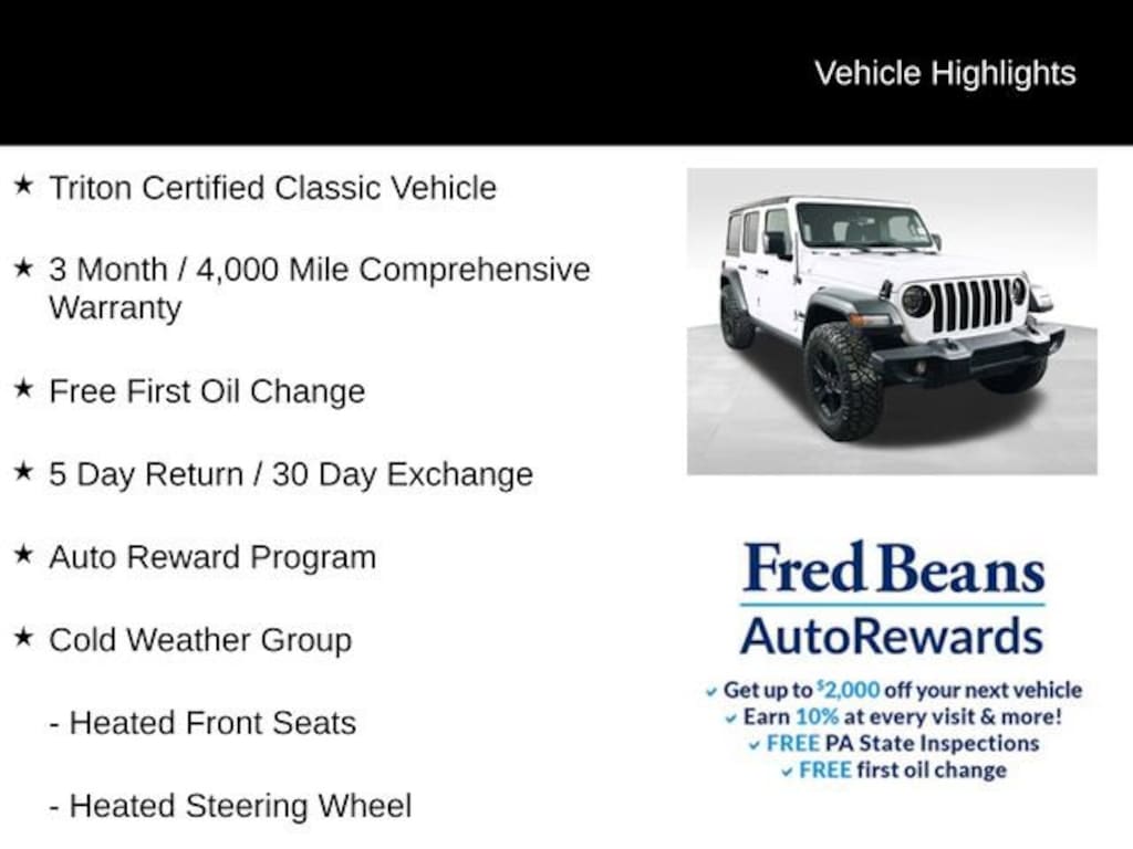 This Wrangler Unlimited Sport Altitude is more than just a rugged off-road machine. It's a meticulously maintained, Triton Certified Classic Vehicle, backed by a comprehensive 3-month/4,000-mile warranty and a host of premium features. Indulge in the convenience of remote keyless entry, the comfort of heated front seats and a heated steering wheel, and the connectivity of Apple CarPlay and Android Auto. Experience the ultimate in open-air driving with the freedom of the Wrangler's iconic design.