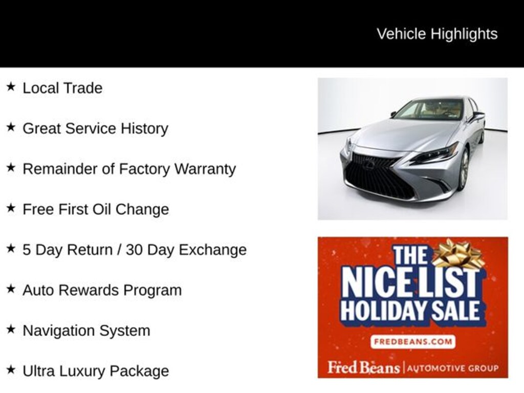 2022 Lexus ES 300h Ultra Luxury 300h Ultra Luxury 2.5L I4 DOHC 16V eCVT FWD 4D Sedan Iridium Local Trade, Great Service History, Remainder of Factory Warranty, Free First Oil Change, 5 Day Return / 30 Day Exchange, Auto Rewards Program, 2.5L I4 DOHC 16V, Rich Cream Leather, 10.2" Head-Up Display (HUD), Accessory Package (PPO), Acoustic Side Glass, Alloy Wheel Locks, Alloy wheels, Apple CarPlay/Android Auto, Auto High-beam Headlights, Exterior Parking Camera Rear, Front dual zone A/C, Hands-Free Power Open/Close Trunk, Heads-Up Display, Heated & Ventilated Seats, Heated door mirrors, Heated steering wheel, Illuminated entry, Intuitive Parking Assist & Panoramic View Monitor, Leather Shift Knob, Leather steering wheel, Memory seat, Navigation System, Power door mirrors, Power driver seat, Power moonroof, Power passenger seat, Power Rear Sunshade, Power Tilt/Telescoping Steering Wheel w/Memory, Radio: Lexus Multimedia System, Rain Sensing Wipers, Steering wheel mounted audio controls, Turn signal indicator mirrors, Ultra Luxury Package, Windshield De-Icer, Wireless Charger.
