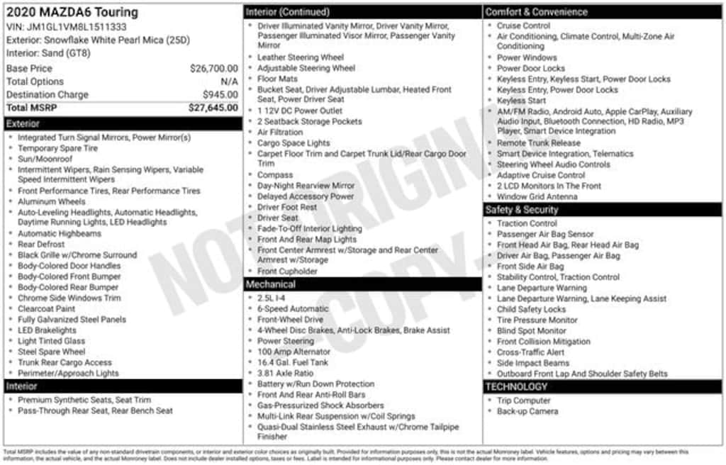 Don't miss your chance to own this exceptional 2020 Mazda Mazda6 Touring. Schedule a test drive today and experience the perfect blend of performance, technology, and luxury that this vehicle has to offer.
