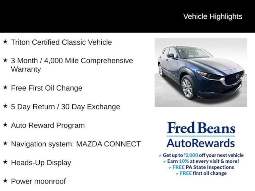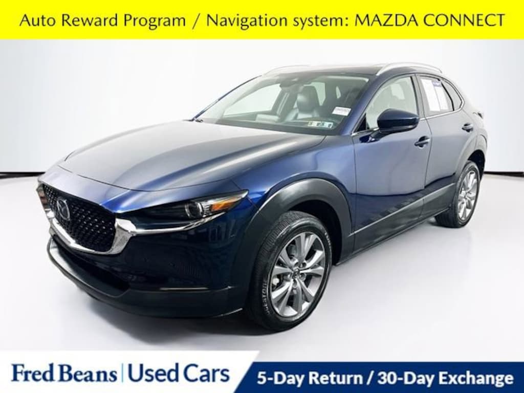 2022 Mazda CX-30 2.5 S Premium Package SKYACTIV® 2.5L 4-Cylinder DOHC 16V 6-Speed Automatic AWD 4D Sport Utility Deep Crystal Blue Mica Triton Certified Classic Vehicle, 3 Month / 4,000 Mile Comprehensive Warranty, Free First Oil Change, 5 Day Return / 30 Day Exchange, Auto Reward Program, Heads-Up Display, Navigation system: MAZDA CONNECT, Power Liftgate, Power moonroof.