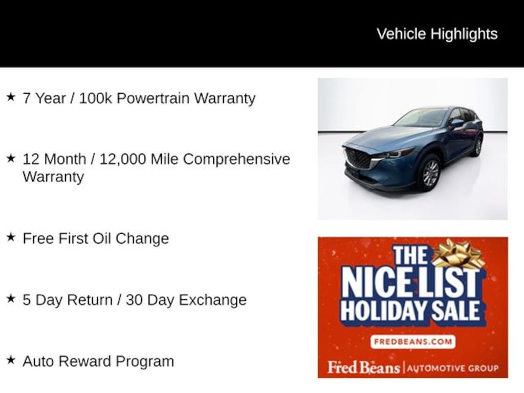 CARFAX One-Owner. Clean CARFAX. 24/30 City/Highway MPG 2023 Mazda CX-5 2.5 S Select Package SKYACTIV® 2.5L 4-Cylinder DOHC 16V 6-Speed Automatic AWD 4D Sport Utility Eternal Blue Mica For better peace of mind all our used vehicles have a 127-point inspection and come with a 5-day return, 30-day exchange (As-Is vehicles are excluded). Our exclusive Auto Rewards Program provides better value with Free First Oil change, Free Pa State Safety inspections, discounts for local merchants and more. Plus, you can earn up to $2000 towards your next vehicle just by servicing with Fred Beans! As Fred Beans always says, our used cars are better because our reputation depends on it.