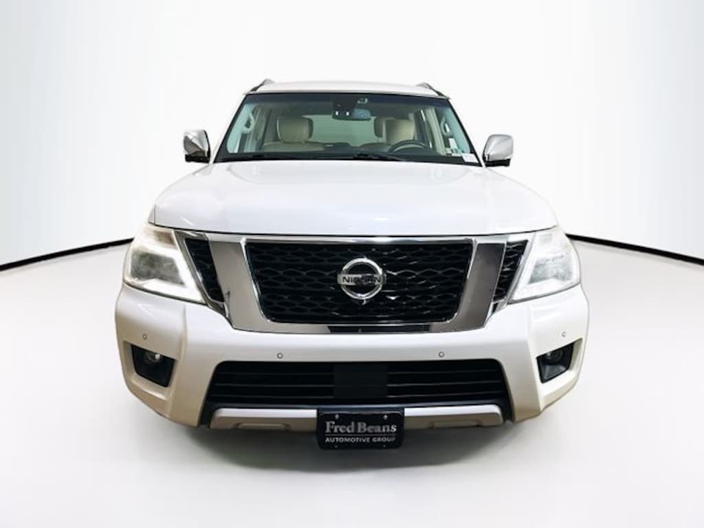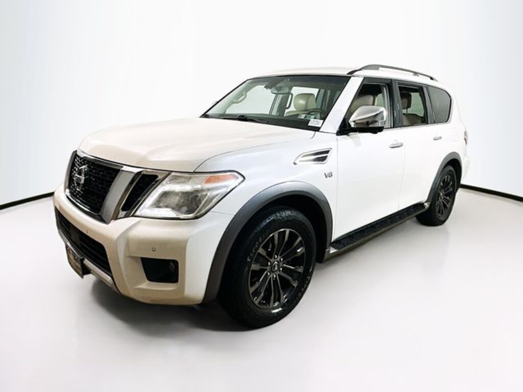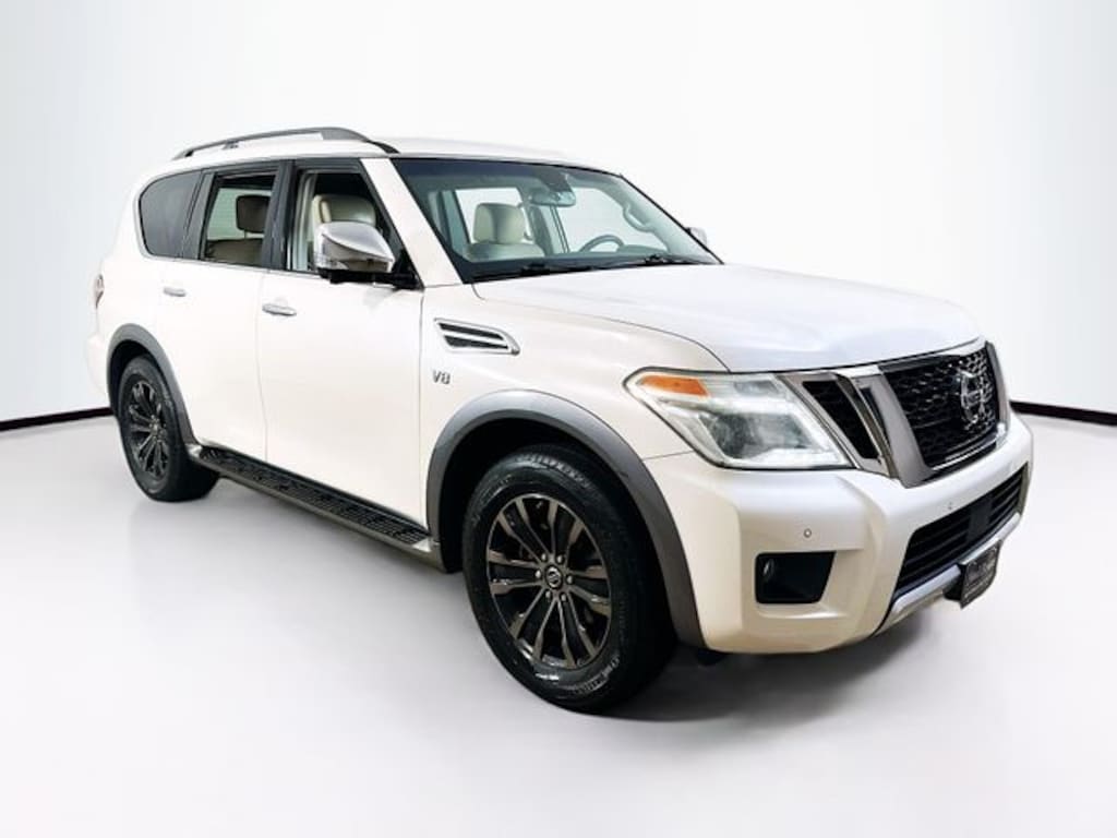 2017 Nissan Armada Platinum 5.6L V8 DOHC 32V Endurance 7-Speed Automatic 4WD 4D Sport Utility Pearl White 4WD, 13 Speakers, 2.937 Axle Ratio, 3rd row seats: split-bench, 4-Wheel Disc Brakes, A/V remote, ABS brakes, Air Conditioning, Alloy wheels, AM/FM radio: SiriusXM, Anti-whiplash front head restraints, Auto tilt-away steering wheel, Auto-dimming door mirrors, Auto-dimming Rear-View mirror, Auto-leveling suspension, Automatic temperature control, Brake assist, Bumpers: body-color, Captain Seat Package, Carpeted Floor Mats w/ Captain Seat Package, CD player, Delay-off headlights, Driver door bin, Driver vanity mirror, Dual front impact airbags, Dual front side impact airbags, Electronic Stability Control, Four wheel independent suspension, Front anti-roll bar, Front Bucket Seats, Front Center Armrest, Front dual zone A/C, Front fog lights, Front reading lights, Fully automatic headlights, Garage door transmitter: HomeLink, Headphones, Heated & Cooled Front Bucket Seats, Heated door mirrors, Heated front seats, Heated rear seats, Heated steering wheel, Illuminated entry, Lane Departure Warning System, Leather Shift Knob, Leather-Appointed Seat Trim, Low tire pressure warning, Memory seat, Navigation System, Occupant sensing airbag, Outside temperature display, Overhead airbag, Overhead console, Panic alarm, Passenger door bin, Passenger vanity mirror, Power door mirrors, Power driver seat, Power moonroof, Power passenger seat, Power steering, Power windows, Radio data system, Radio: Bose AM/FM/SXM/CD/MP3 Audio System, Rain sensing wipers, Rear air conditioning, Rear anti-roll bar, Rear reading lights, Rear seat center armrest, Rear window defroster, Rear window wiper, Reclining 3rd row seat, Remote keyless entry, Roof rack: rails only, Second Row Captain's Chairs, Second Row Center Console w/ Padded Armrest, Security system, Speed control, Speed-sensing steering, Speed-Sensitive Wipers, Split folding rear seat, Steering wheel mounted audio controls, Tachometer, Telescoping steering wheel, Tilt steering wheel, Traction control, Trip computer, Turn signal indicator mirrors, Variably intermittent wipers, Ventilated front seats, Voltmeter, Wheels: 20" Machine-Faced Chrome w/Tinted CC, 4WD.
