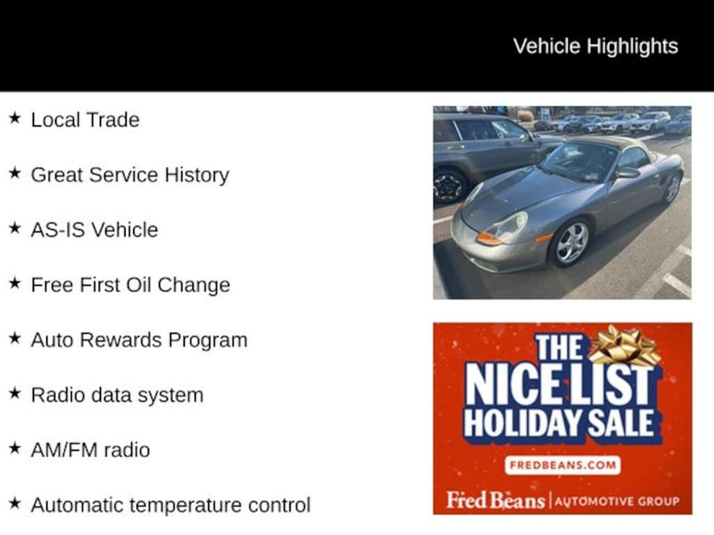 Recent Arrival! 2001 Porsche Boxster Base 2.7L H6 SMPI DOHC 5-Speed Automatic with Tiptronic S RWD 2D Convertible Gray Local Trade, Great Service History, AS-IS Vehicle, Free First Oil Change, Auto Rewards Program, Alloy wheels, AM/FM radio, Automatic temperature control, Convertible roof lining, Four wheel independent suspension, Front fog lights, Heated door mirrors, Leather Shift Knob, Leather steering wheel, Power convertible roof, Power door mirrors, Power driver seat, Power passenger seat, Radio data system.