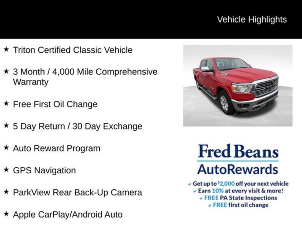 Discover the power and versatility of the 2022 Ram 1500 Laramie, a true workhorse built to handle any task with ease. This exceptional truck is equipped with a HEMI 5.7L V8 engine that delivers impressive performance, combined with the confidence of 4-wheel drive. With an EPA-estimated 21 MPG on the highway, you'll enjoy the perfect balance of capability and efficiency. Triton Certified Classic Vehicle 3 Month / 4,000 Mile Comprehensive Warranty Free First Oil Change 5 Day Return / 30 Day Exchange Auto Reward Program 5.7L V8 HEMI Engine with Multi Displacement VVT Laramie Level 1 Equipment Group Chrome Appearance Group Black, Leather Trimmed Bucket Seats Uconnect 5 Navigation with 8.4 DisplayStep inside the spacious and well-appointed cabin, where you'll find a wealth of premium features designed to enhance your driving experience. Enjoy the convenience of Apple CarPlay and Android Auto, the clarity of the 8.4 touchscreen display, and the added peace of mind from the ParkView Rear Back-Up Camera and Blind Spot Monitoring system.This 2022 Ram 1500 Laramie has been meticulously inspected and certified by our Triton team, ensuring it meets the highest standards of quality and performance. With a comprehensive 3-month/4,000-mile warranty and a free first oil change, you can drive with confidence, knowing that your investment is protected.Whether you're tackling tough jobs or embarking on weekend adventures, the 2022 Ram 1500 Laramie is the perfect companion. Its impressive capabilities, premium features, and Triton Certified status make it a standout choice in the full-size truck segment. Experience the difference for yourself and schedule a test drive today.