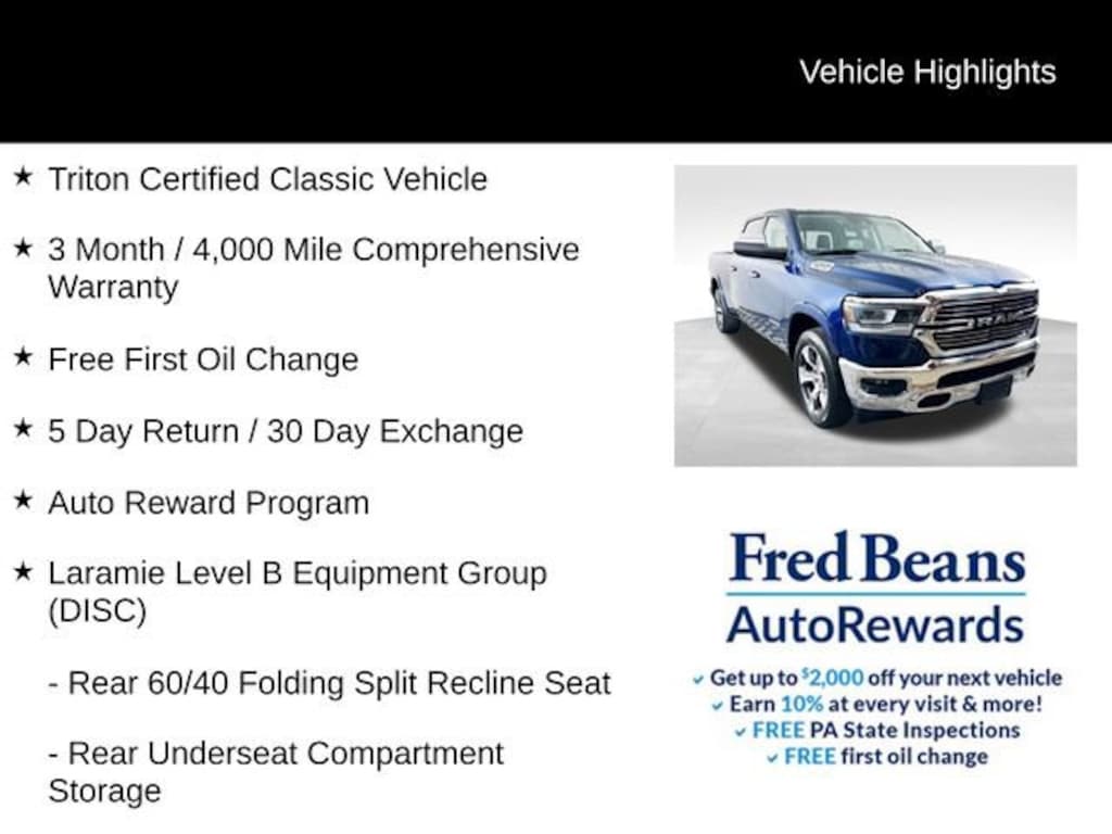 For better peace of mind all our used vehicles have a 127-point inspection and come with a 5-day return, 30-day exchange (As-Is vehicles are excluded). Our exclusive Auto Rewards Program provides better value with Free First Oil change, Free Pa State Safety inspections, discounts for local merchants and more. Plus, you can earn up to $2000 towards your next vehicle just by servicing with Fred Beans! As Fred Beans always says, our used cars are better because our reputation depends on it.