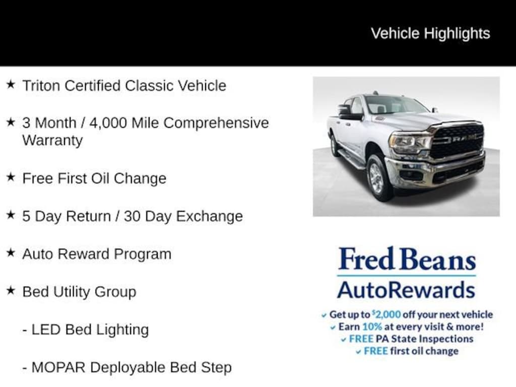 This vehicle is Triton Certified, meaning it has undergone a thorough inspection and comes with a comprehensive warranty, giving you peace of mind and assurance in your purchase. With its impressive features and capabilities, this 2024 Ram 2500 Big Horn is the perfect companion for your next adventure.