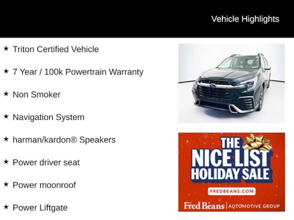 2023 Subaru Ascent Touring 2.4L 4-Cylinder DOHC 16V Lineartronic CVT AWD 4D Sport Utility Crystal Black Silica Triton Certified Vehicle, 7 Year / 100k Powertrain Warranty, Non Smoker, harman/kardon® Speakers, Heated & Ventilated Front Bucket Seats, Heated rear seats, Heated steering wheel, Navigation System, Power driver seat, Power Liftgate, Power moonroof, STARLINK/Apple CarPlay/Android Auto.
