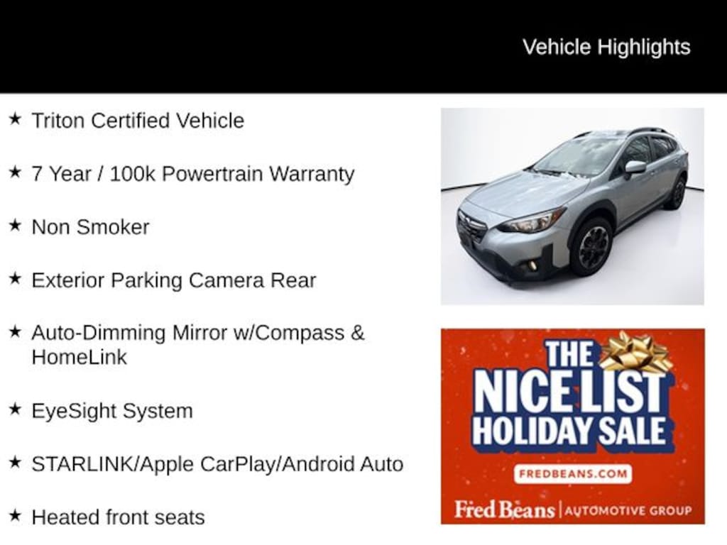 Recent Arrival! 2023 Subaru Crosstrek Premium 2.0L 4-Cylinder DOHC 16V Lineartronic CVT AWD 4D Sport Utility Ice Silver Metallic Triton Certified Vehicle, 7 Year / 100k Powertrain Warranty, Non Smoker, Auto-Dimming Mirror w/Compass & HomeLink, Exterior Parking Camera Rear, EyeSight System, Heated front seats, STARLINK/Apple CarPlay/Android Auto.