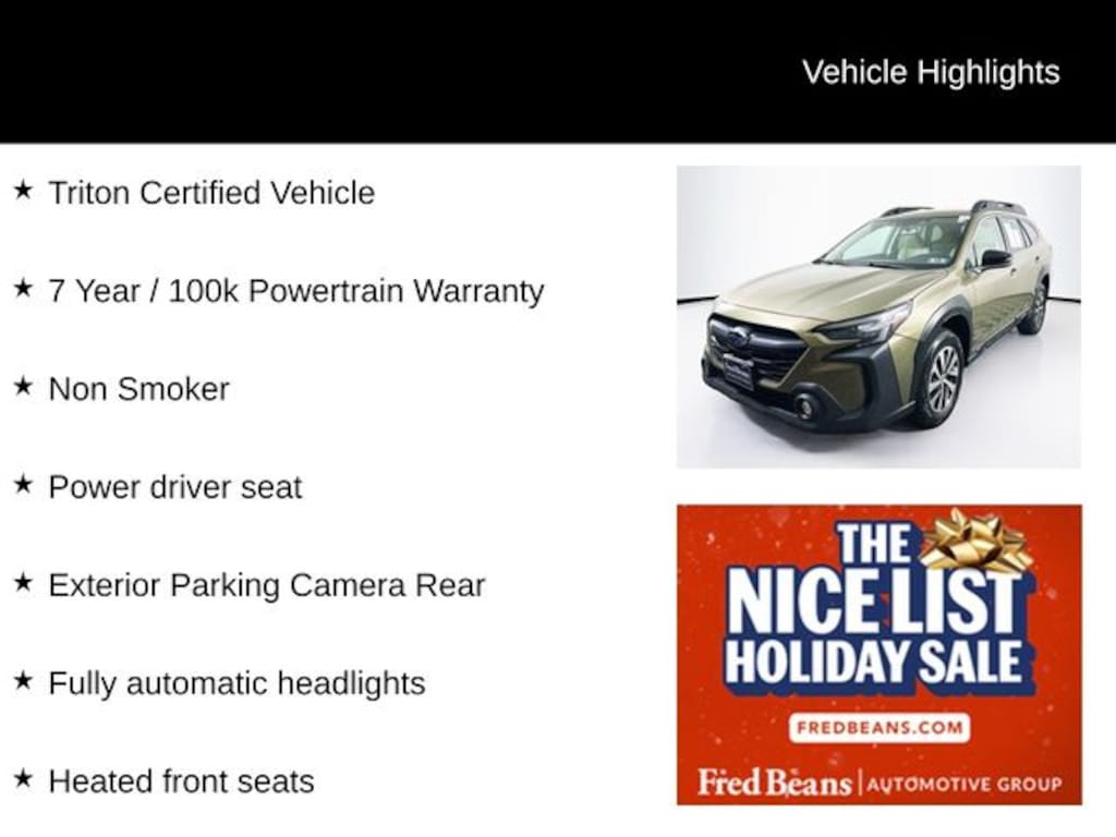 2023 Subaru Outback Premium 2.5L 4-Cylinder DOHC 16V CVT Lineartronic AWD 4D Sport Utility Green Metallic Triton Certified Vehicle, 7 Year / 100k Powertrain Warranty, Non Smoker, Exterior Parking Camera Rear, Fully automatic headlights, Heated front seats, Power driver seat.