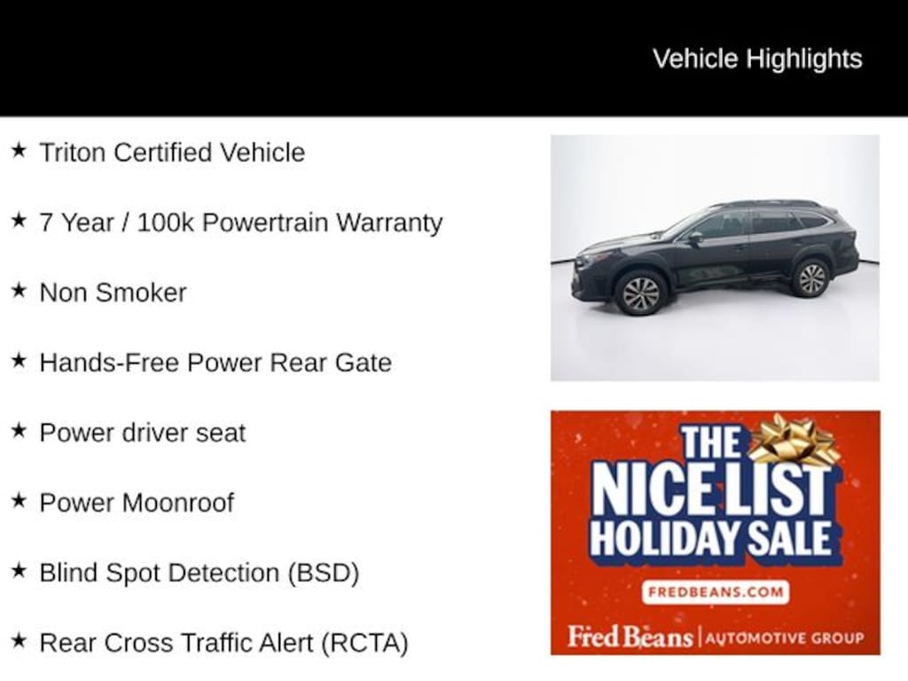 2023 Subaru Outback Premium 2.5L 4-Cylinder DOHC 16V CVT Lineartronic AWD 4D Sport Utility Crystal Black Silica Triton Certified Vehicle, 7 Year / 100k Powertrain Warranty, Non Smoker, Blind Spot Detection (BSD), Hands-Free Power Rear Gate, Heated front seats, Power driver seat, Power Moonroof, Rear Cross Traffic Alert (RCTA).