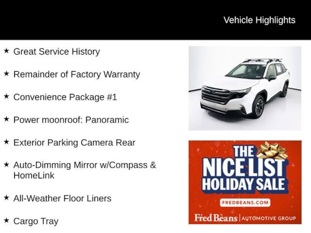 2025 Subaru Forester Premium 2.5L 4-Cylinder DOHC 16V Lineartronic CVT AWD 4D Sport Utility Crystal White Pearl Great Service History, Remainder of Factory Warranty, All-Weather Floor Liners, Auto-Dimming Mirror w/Compass & HomeLink, Cargo Tray, Convenience Package #1, Exterior Parking Camera Rear, Power moonroof: Panoramic.