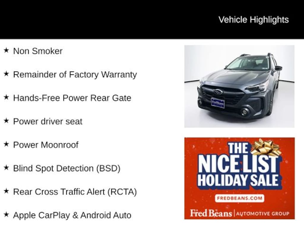 2025 Subaru Outback Premium 2.5L 4-Cylinder DOHC 16V CVT Lineartronic AWD 4D Sport Utility Magnetite Gray Metallic Non Smoker, Remainder of Factory Warranty, Apple CarPlay & Android Auto, Blind Spot Detection (BSD), Hands-Free Power Rear Gate, Heated front seats, Power driver seat, Power Moonroof, Rear Cross Traffic Alert (RCTA).