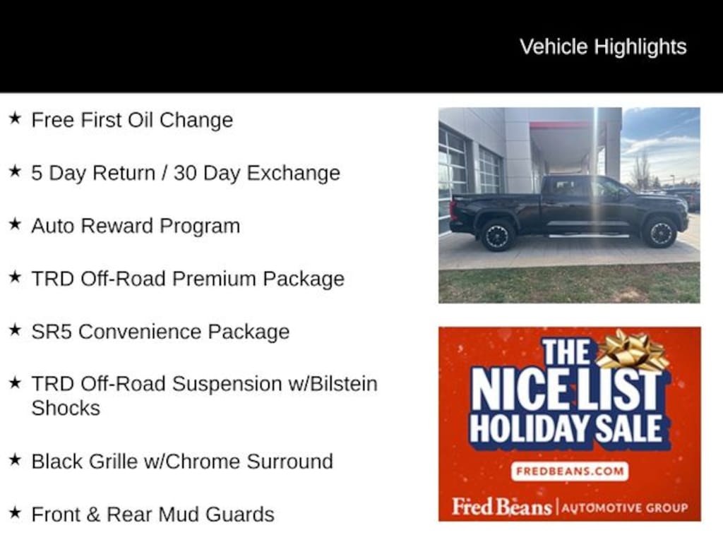 2022 Toyota Tundra SR5 3.4L V6 10-Speed Automatic 4WD 4D CrewMax Midnight Black Metallic Free First Oil Change, 5 Day Return / 30 Day Exchange, Auto Reward Program, Tundra SR5, 4D CrewMax, 3.4L V6, 10-Speed Automatic, 4WD, Midnight Black Metallic, Black w/SofTex Seat Trim, Bedside TRD Off Road Decal, Black Grille w/Chrome Surround, Blind Spot Monitor w/Lane Change Assist, Front & Rear Mud Guards, Heated Leather Steering Wheel, Parking Support Alert/Brake, SofTex Seat Trim, SR5 Convenience Package, TRD Off-Road Premium Package, TRD Off-Road Suspension w/Bilstein Shocks.