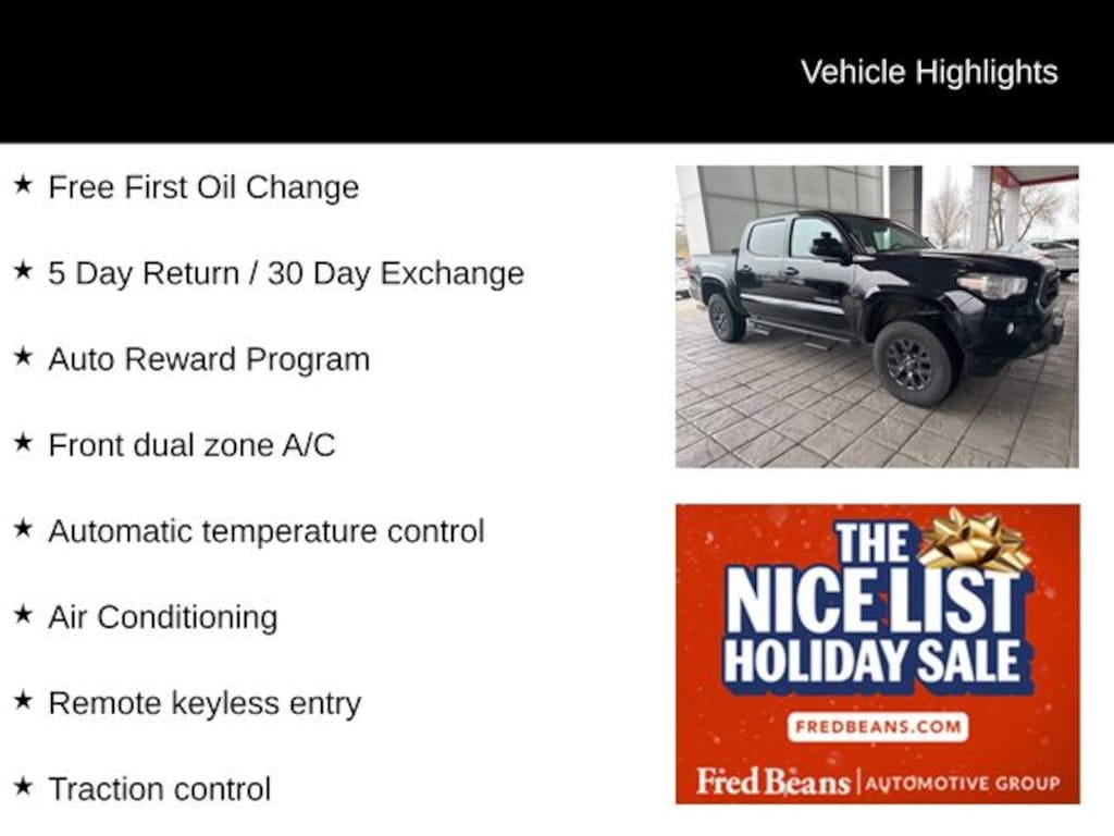 2023 Toyota Tacoma SR5 V6 3.5L V6 6-Speed Automatic 4WD 4D Double Cab Black Free First Oil Change, 5 Day Return / 30 Day Exchange, Auto Reward Program, Tacoma SR5 V6, 4D Double Cab, 3.5L V6, 6-Speed Automatic, 4WD, Black, Cement w/Fabric Seat Trim, ABS brakes, Active Cruise Control, Air Conditioning, Alloy wheels, Automatic temperature control, Electronic Stability Control, Front dual zone A/C, Heated door mirrors, Illuminated entry, Low tire pressure warning, Remote keyless entry, Traction control.