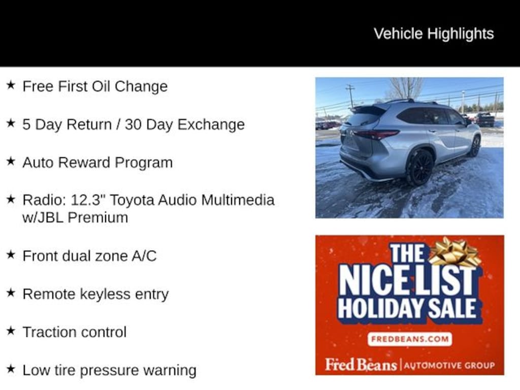 Recent Arrival! 2024 Toyota Highlander XSE 2.4L I4 PDI Turbocharged DOHC 16V LEV3-SULEV30 265hp 8-Speed Automatic AWD 4D Sport Utility Celestial Silver Metallic Free First Oil Change, 5 Day Return / 30 Day Exchange, Auto Reward Program, Highlander XSE, 4D Sport Utility, 2.4L I4 PDI Turbocharged DOHC 16V LEV3-SULEV30 265hp, 8-Speed Automatic, AWD, Celestial Silver Metallic, Cockpit Red w/Leather Seat Trim, ABS brakes, Active Cruise Control, Alloy wheels, Electronic Stability Control, Front dual zone A/C, Heated door mirrors, Heated Front Bucket Seats, Heated front seats, Illuminated entry, Low tire pressure warning, Power Liftgate, Power moonroof, Radio: 12.3" Toyota Audio Multimedia w/JBL Premium, Remote keyless entry, Traction control.