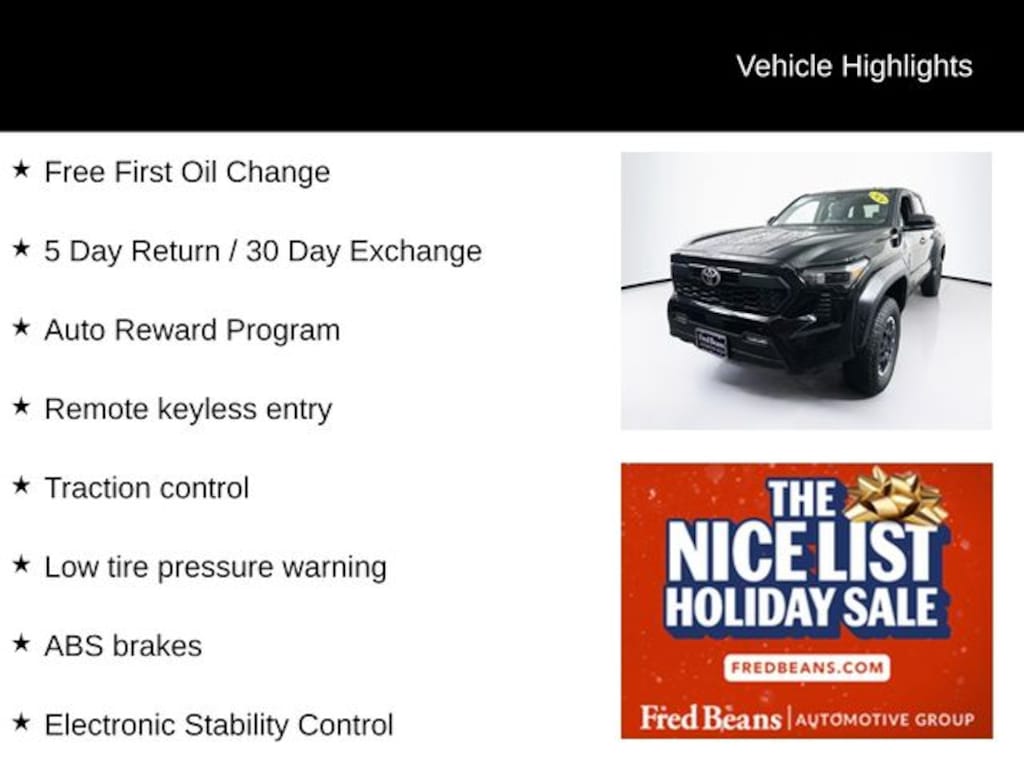 2024 Toyota Tacoma TRD Off-Road 2.4L 4-Cylinder 8-Speed Automatic 4WD 4D Double Cab Black Free First Oil Change, 5 Day Return / 30 Day Exchange, Auto Reward Program, Tacoma TRD Offroad, 4D Double Cab, 2.4L 4-Cylinder, 8-Speed Automatic, 4WD, Black, Black w/Fabric Seat Trim, ABS brakes, Alloy wheels, Electronic Stability Control, Heated door mirrors, Illuminated entry, Low tire pressure warning, Remote keyless entry, Traction control.