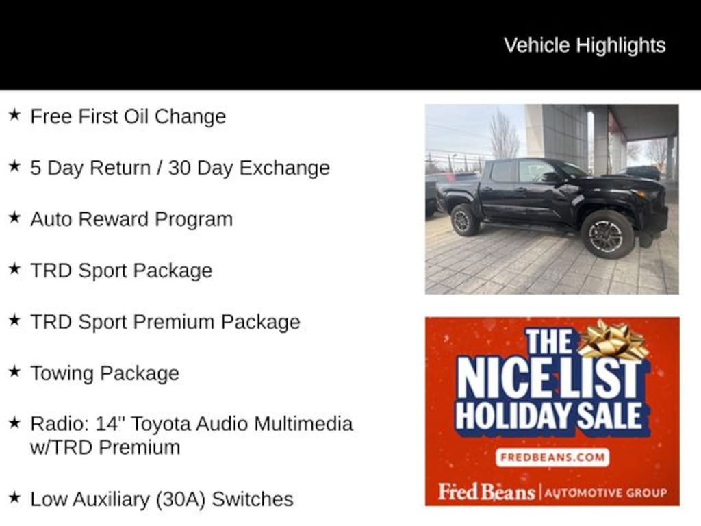 Recent Arrival! 2025 Toyota Tacoma TRD Sport 2.4L 4-Cylinder 8-Speed Automatic 4WD 4D Double Cab Black Free First Oil Change, 5 Day Return / 30 Day Exchange, Auto Reward Program, Tacoma TRD Sport, 4D Double Cab, 2.4L 4-Cylinder, 8-Speed Automatic, 4WD, Black, Black w/SofTex Seat Trim, 3D Panoramic View Monitor, 8-Way Power Driver & Passenger Seat Adjusters, ABS brakes, Alloy wheels, Digital Rearview Mirror, Electronic Stability Control, Heated door mirrors, Heated Front Seats, Heated Leather-Trimmed Steering Wheel, Illuminated entry, Low Auxiliary (30A) Switches, Low tire pressure warning, Power Horizontal Rear Window, Power Tilt/Slide Moonroof w/Sliding Sunshade, Pre-Wire Accommodation (Bed Power Port), Radio: 14" Toyota Audio Multimedia w/TRD Premium, Remote keyless entry, Smart Key w/Digital Key Technology, TACOMA Stamped Power Open & Close Tailgate, Towing Package, Traction control, TRD Sport Package, TRD Sport Premium Package.